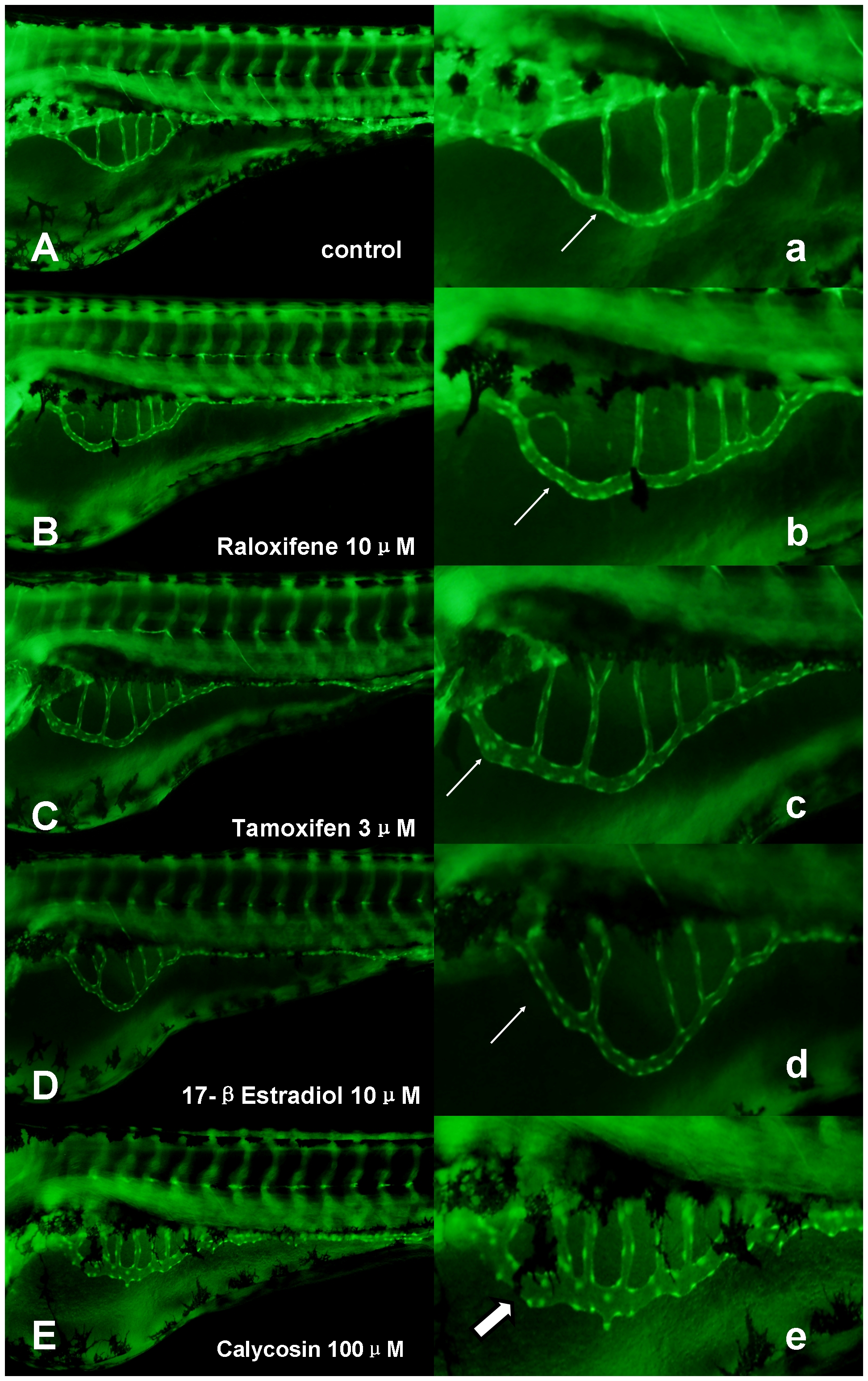 (A) Controls: were treated with 0.1% DMSO at 96 hpf, showing no effect on vessel formation (B–E) were treated with 10 μM raloxifene, 3 μM tamoxifen, 10 μM 17-β-Estradiol and 100 μM calycosin at 72 hpf for 24 h. (a–e) Enlarged SIV region (x4.5) of A–E respectively. Abnormal phenotype of blood vessel formation in SIVs was indicated by white arrow, showing slight increase in vessel diameter. Significant increase in vessel diameter was indicated by thick white arrow.