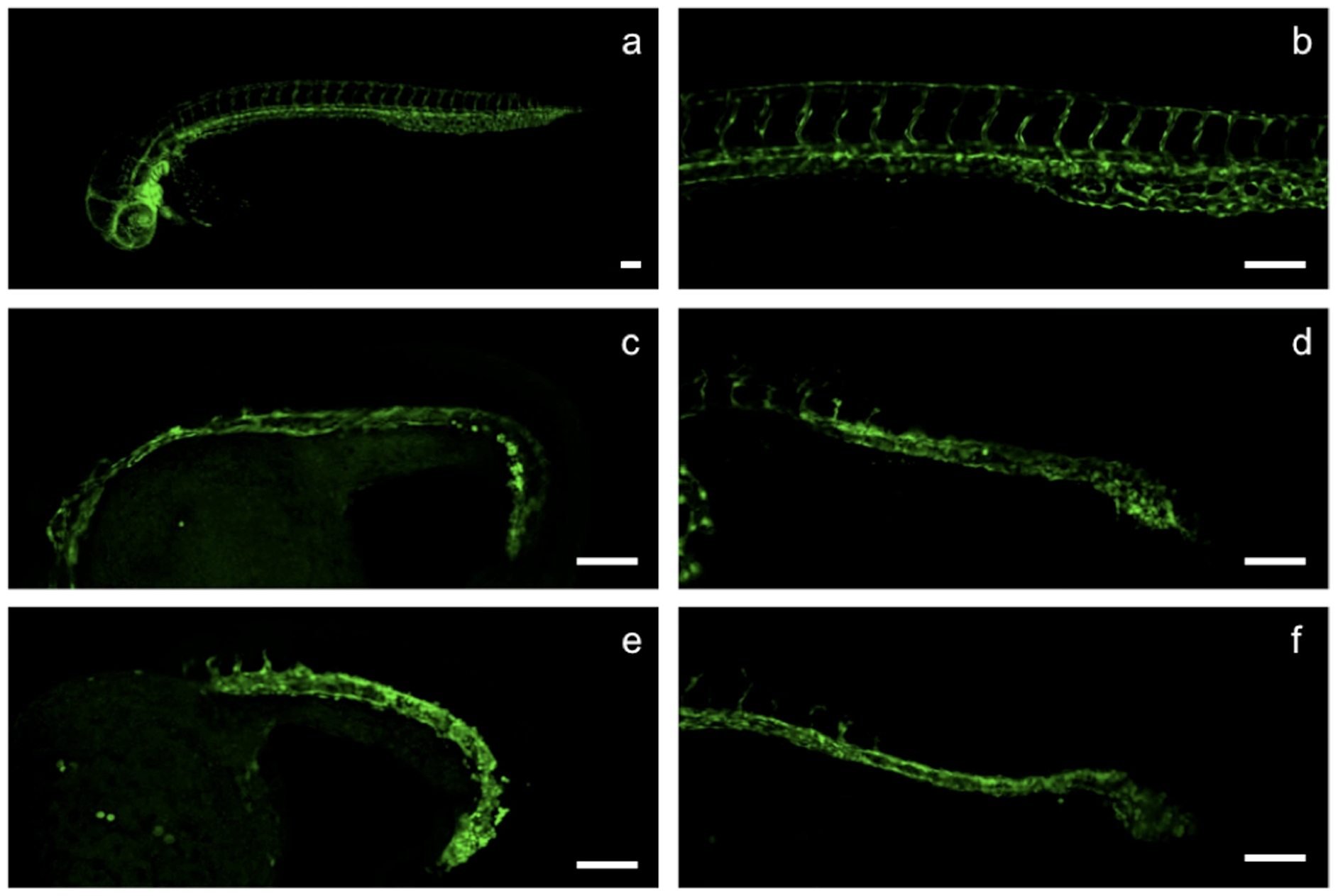 All embryos are 40 hpf, with anterior to the left, scale bar = 100 μm. a, b, DMSO-treated control; c, embryo treated with 200 μg/ml O. sinuatum extract; d, embryo treated with 10 μg/ml P. barbatus extract; e, embryo treated with 8 μM emodin; f, embryo treated with 2 μM coleon AL.