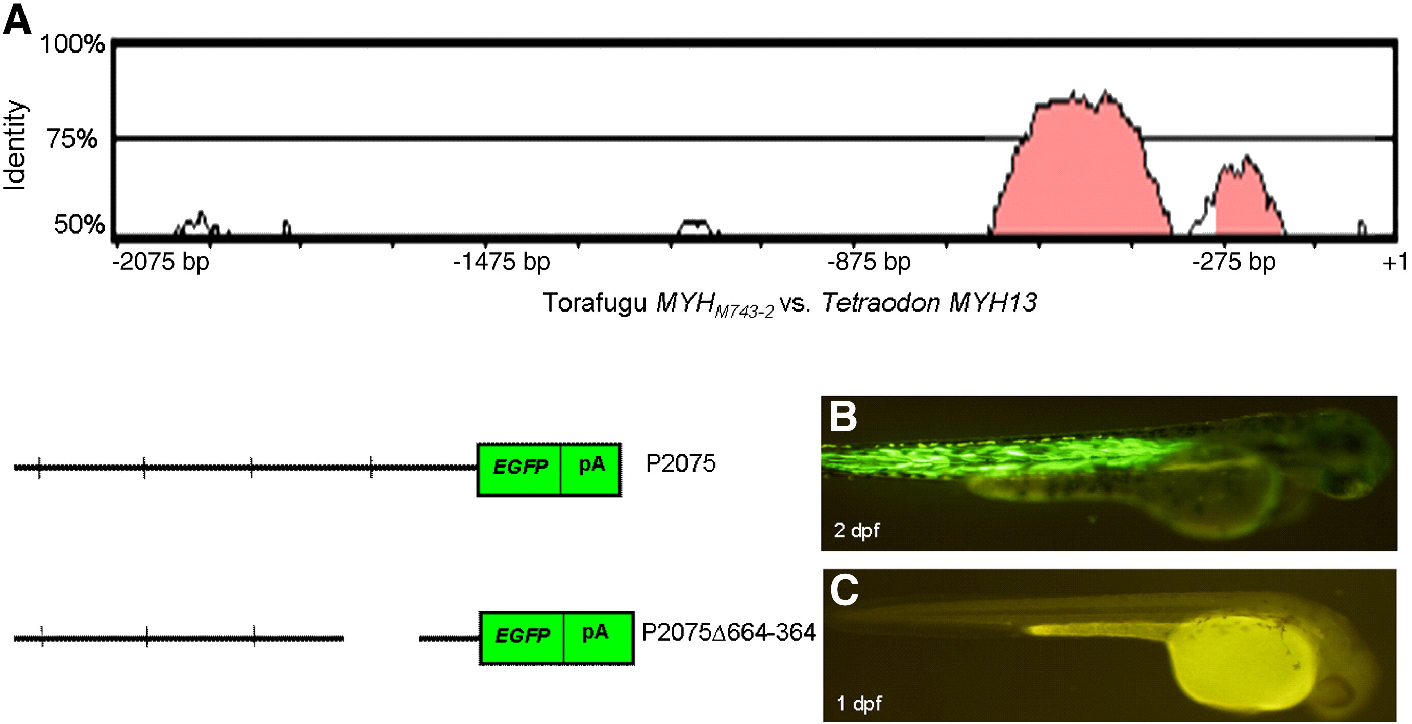 The - 664 to - 364 bp region in the 52-flanking region of MYHM743-2 is crucial for its promoter activity. A:. rVISTA plot showing homology (- 664 to - 364 bp region) in pairwise sequence alignments between - 2075 bp of torafugu MYHM743-2 and the corresponding region of the Tetraodon orthologue. Peaks are shown relative to their positions in MYHM743-2 and their percent identities (50%–100%) are indicated on the vertical axis. B: EGFP expression was observed in the whole myotomal region in larvae microinjected with the P2075 construct. C: No EGFP expression was observed in embryos injected with the P2075Δ664-364 construct.