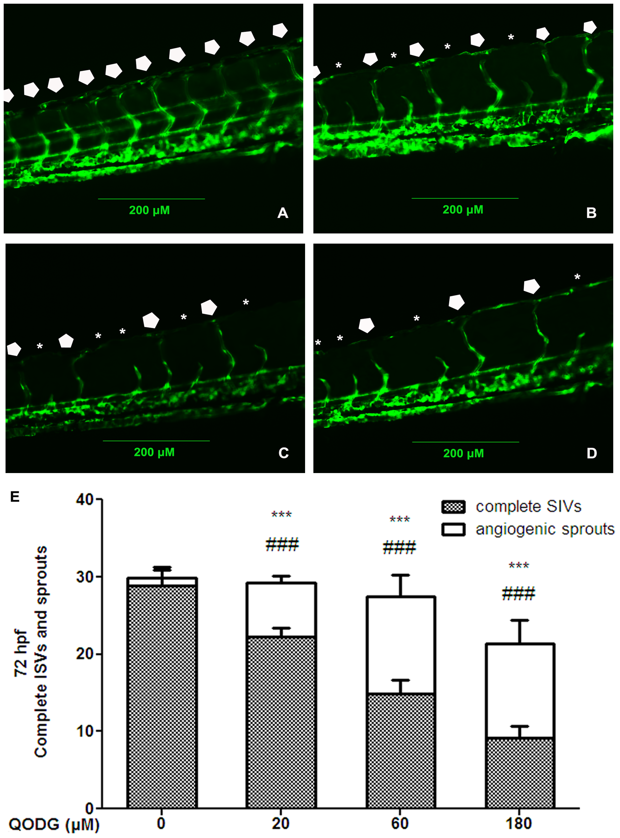 (A) Vehicle control: Tg(fli1:EGFP) zebrafish embryos were treated with 0.1% DMSO from 6 hours post fertilization (hpf) to 72 hpf. All intersegmental vessels (ISVs) in the vehicle control group have fully extended to form the dorsal longitudinal anastomotic vessels (DLAVs) at 72 hpf. (B–D) QODG-treated groups: Tg(fli1:EGFP) zebrafish embryos were treated with various concentrations of QODG (20, 60, 180 μM) from 6 hpf to 72 hpf. Pentagons indicate the sites of complete ISVs in zebrafish embryos for all figures, and asterisks indicate the sites of angiogenic sprouts in zebrafish embryos for all figures. (E) Quantitative comparison of blood vessel formation in the vehicle control group and QODG-treated groups. Data are expressed as mean ± SD from three independent experiments. *, the number of complete ISVs in QODG-treated group compared with that in the vehicle control group; ***, P<0.001 vs. vehicle control. #, the number of angiogenic sprouts in QODG-treated group compared with that in the vehicle control group; ###, P<0.001 vs. vehicle control. Scale bars, 200 μm.