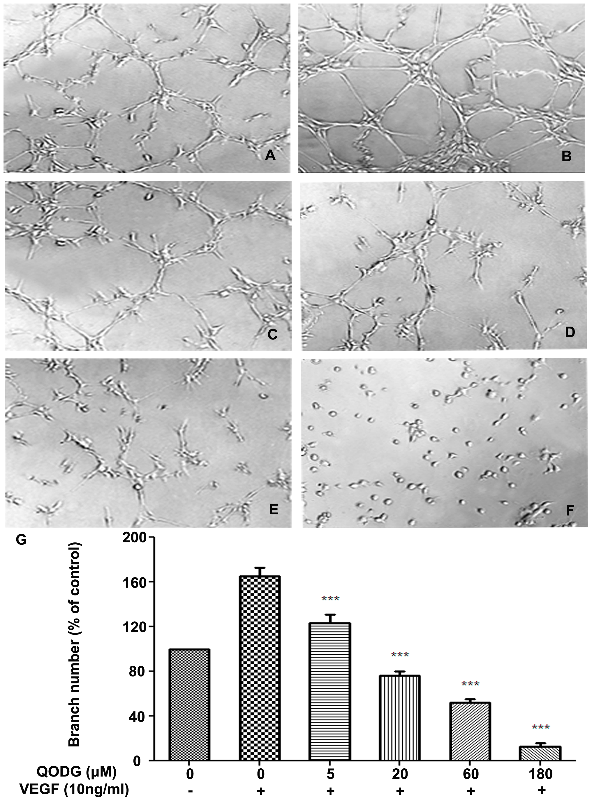 QODG inhibits VEGF-induced capillary structure formation of endothelial cells on Matrigel.