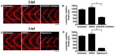 Red fluorescent images from late-phase microangiograms of Tg(fli1:EGFP)y1 zebrafish are shown, highlighting Texas Red-LMD uptake within lymphatic capillaries. Results of quantitative morphometric analyses are displayed in bar graphs. A and B, Addition of hVEGFR-3 inhibitor in DMSO (n = 30) or rapamycin in DMSO (n = 18) to the aqueous environment significantly reduced lymphatic capillary development at 3 dpf, compared to zebrafish exposed to DMSO alone (n = 21 and 15, respectively). *P<0.0001, **P<0.0001. Scale bars, 50 μm.