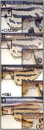 Fig. S2 Mtz-treated 1° females lack a prominent cloaca (A-D) Anal fins of Tg(ziwi:CFP-NTR) fish with cloaca boxed and magnified in bottom right of each panel. Dotted lines delineate the cloaca. (A) DMSO-treated Tg(ziwi:CFP-NTR) female. (B) Pre-treatment Tg(ziwi:CFP-NTR) 1° female. (C) 2 mo post-treatment Tg(ziwi:CFP-NTR) 1° female. (D) Control Tg(ziwi:CFP-NTR) male. Image contrast adjusted for clarity.