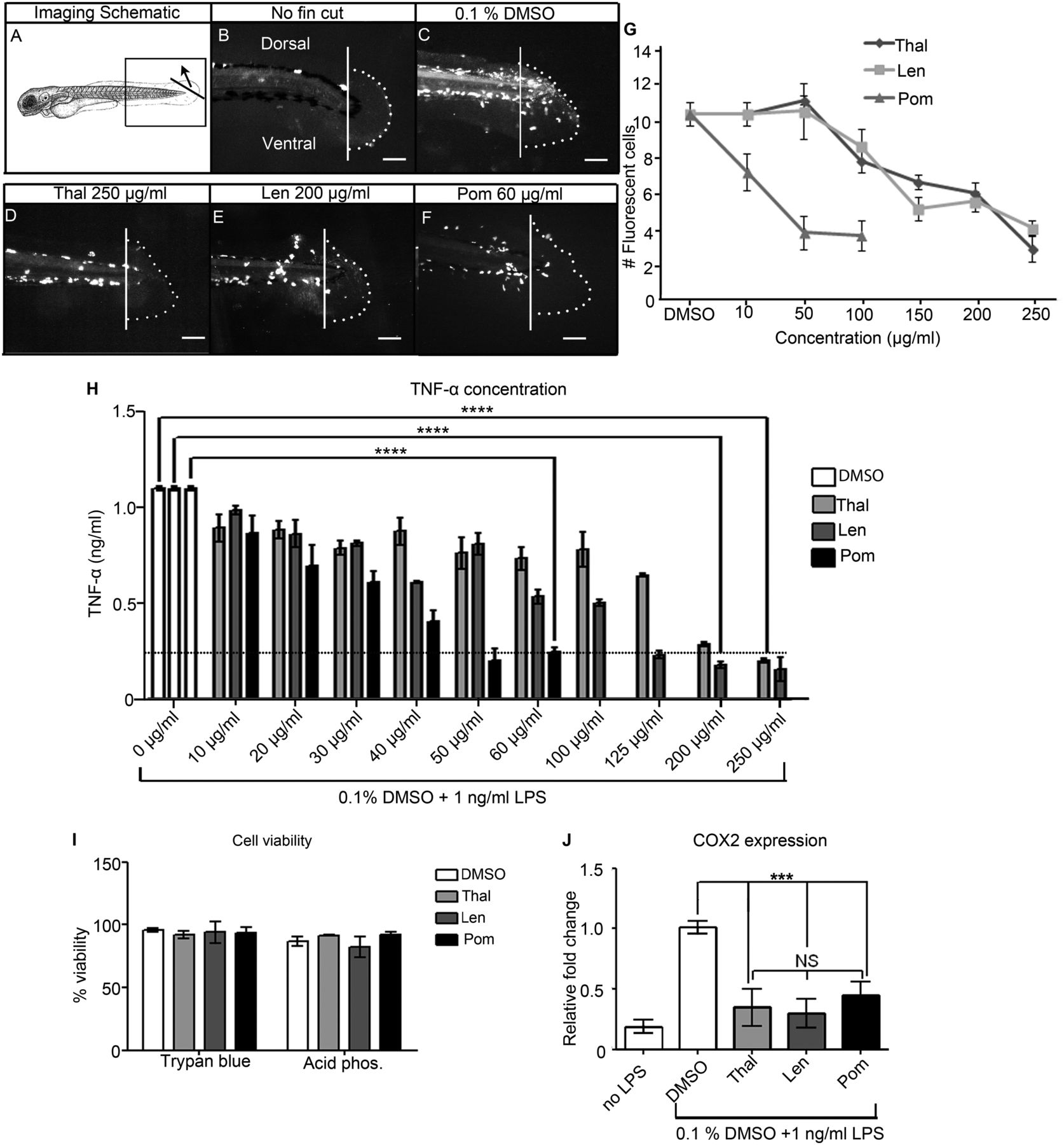 Identification of potent anti-inflammatory concentrations, in embryological assays, of Thalidomide, Lenalidomide, and Pomalidomide. Following tail fin transsection (line in tail fin in A), Tg(MPO::EGFP)114 zebrafish (72 hpf) were incubated with DMSO/compound. (B and C) Embryos were imaged 24 h after operation. (C) Fin cut with DMSO incubation showed cell migration to the wound site. (D–F) Thalidomide (Thal), Lenalidomide (Len), and Pomalidomide (Pom) reduce the number of migrating cells. (G) Graphical representation of the number of migrating cells following drug incubation; note Thalidomide and Lenalidomide require a higher concentration to induce the same response as Pomalidomide. (H) In vitro quantification of TNF-α production, from LPS-stimulated RAW 264.7 cells, by ELISA. Dotted line marks the maximal level of TNF-α reduction by Pomalidomide, which is not reached by Lenalidomide and Thalidomide until 200 and 250 μg/mL (772 and 968μM) respectively. (I) Cell viability, measured using trypan blue and acid phosphatase, was not altered. (J) The qRT-PCR showed a significant decrease in COX2 expression following Thalidomide, Lenalidomide, and Pomalidomide treatment. Graphs represent mean ± SEM. Statistics: (H) statistical significance was analyzed using Student’s t test. (I and J) Statistical significance was analyzed using one-way ANOVA with Tukey’s post hoc test; *P < 0.05; **P < 0.005; ***P < 0.0005, ****P < 0.0001; NS (not significant), P > 0.05. (Scale bars: 100 μm.)