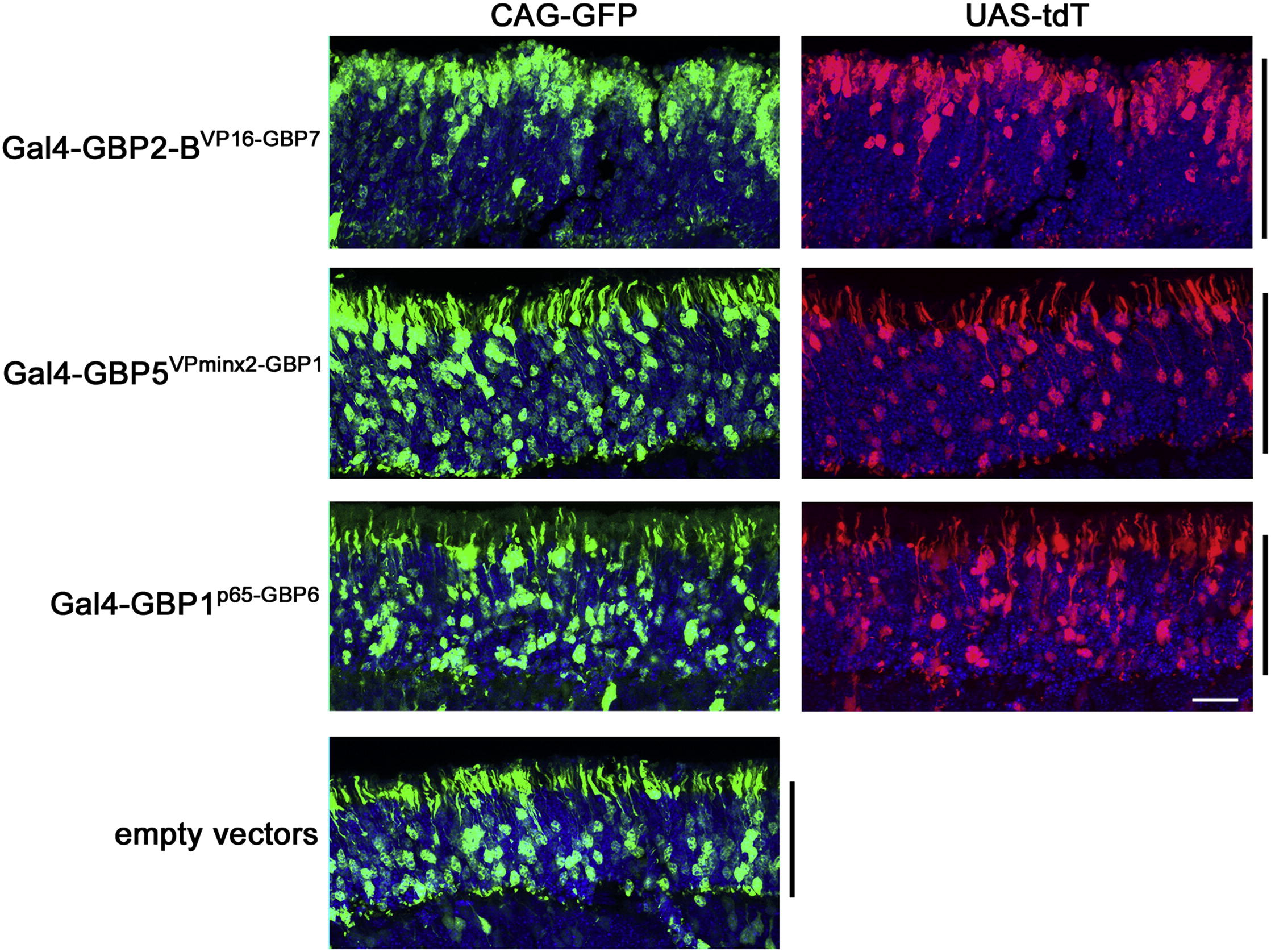 Representative images showing the effects of selected T-DDOGs on rod photoreceptor positioning. CD1 mouse retinas were electroporated at P0 in vivo with plasmids encoding CAG-GFP (green), Gal4-GBPXAD-GBPY components, UAS-tdT (red) and CAG-nlacZ. The electroporated GFP:DBDG:ADG plasmid mass ratio is 2:2:1. Retinas were harvested at P14. Confocal stacks of retina sections spanning the ONL (black bar) are shown. Each set of panels was adjusted individually to similar levels to reveal the cell bodies. DAPI is blue in all panels. Scale bar, 20 μm. Non-linear adjustment using the gamma function was applied to show weak GFP or tdT-expressing cells to minimize their signals from being obscured by those of stronger-expressing equivalents. The scleral portion of the ONL is the upper half of each image.