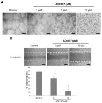 AD0157 inhibits endothelial cell tube formation and migration. (A) BAEC seeded on Matrigel formed tubes. AD0157 inhibited endothelial cell tubulogenesis in vitro in a dose-dependent manner at non-toxic doses. Cells were photographed 7 h after seeding under an inverted microscope (bar = 100 μm); (B) Top panel: confluent BAEC monolayers were wounded, and fresh culture medium was added either in the absence or presence of the indicated concentrations of the compound. Photographs were taken at 7 h of incubation. Broken lines indicate the wound edges (bar = 100 μm); Bottom panel: The regrowth of BAEC into the cell-free area was measured after 7 h, and percentages of the recovered area are expressed as the mean ± SD, * p < 0.05 versus the control (n = 3).