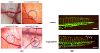 Fig. 5 AD0157 inhibits angiogenesis in vivo. (A) Chorioallantoic membrane assay (CAM). The methylcellulose disc containing the substance vehicle alone and the methylcellulose disc containing 0.5, one and 5 nmol of AD0157. Circles show the locations of the methylcellulose discs (bar = 1 mm); (B) Inhibition of the zebrafish neovascularization by AD0157. Transgenic TG(fli1:EGFP)y1 zebrafish embryos that show green fluorescent protein (GFP) expression in endothelial cells were incubated without or with 10 μM AD0157 (bars represent 50 μm).