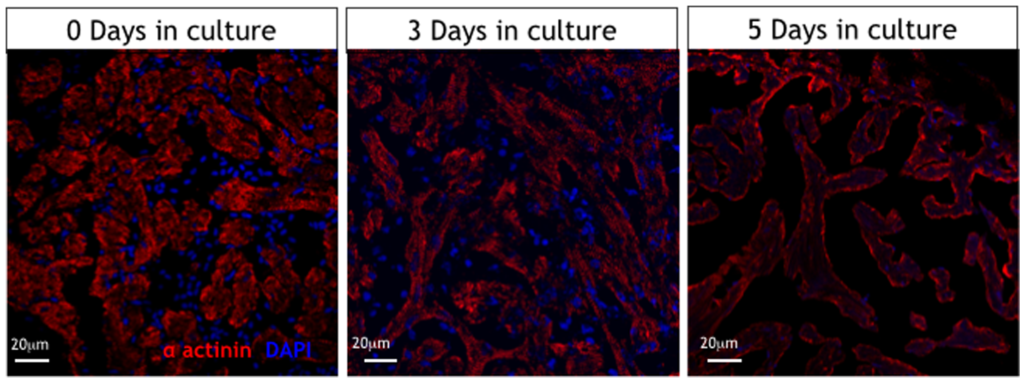 Alpha-actinin immunostaining showing well preserved sarcomere patterns in cardiomyocytes of cultured hearts at day 0 and day 3 with loss of this typical pattern by day 5 in culture. (red is sarcomeric alpha-actinin (mouse, clone EA-53, Abcam), blue is DAPI (Serva Heidelberg)).