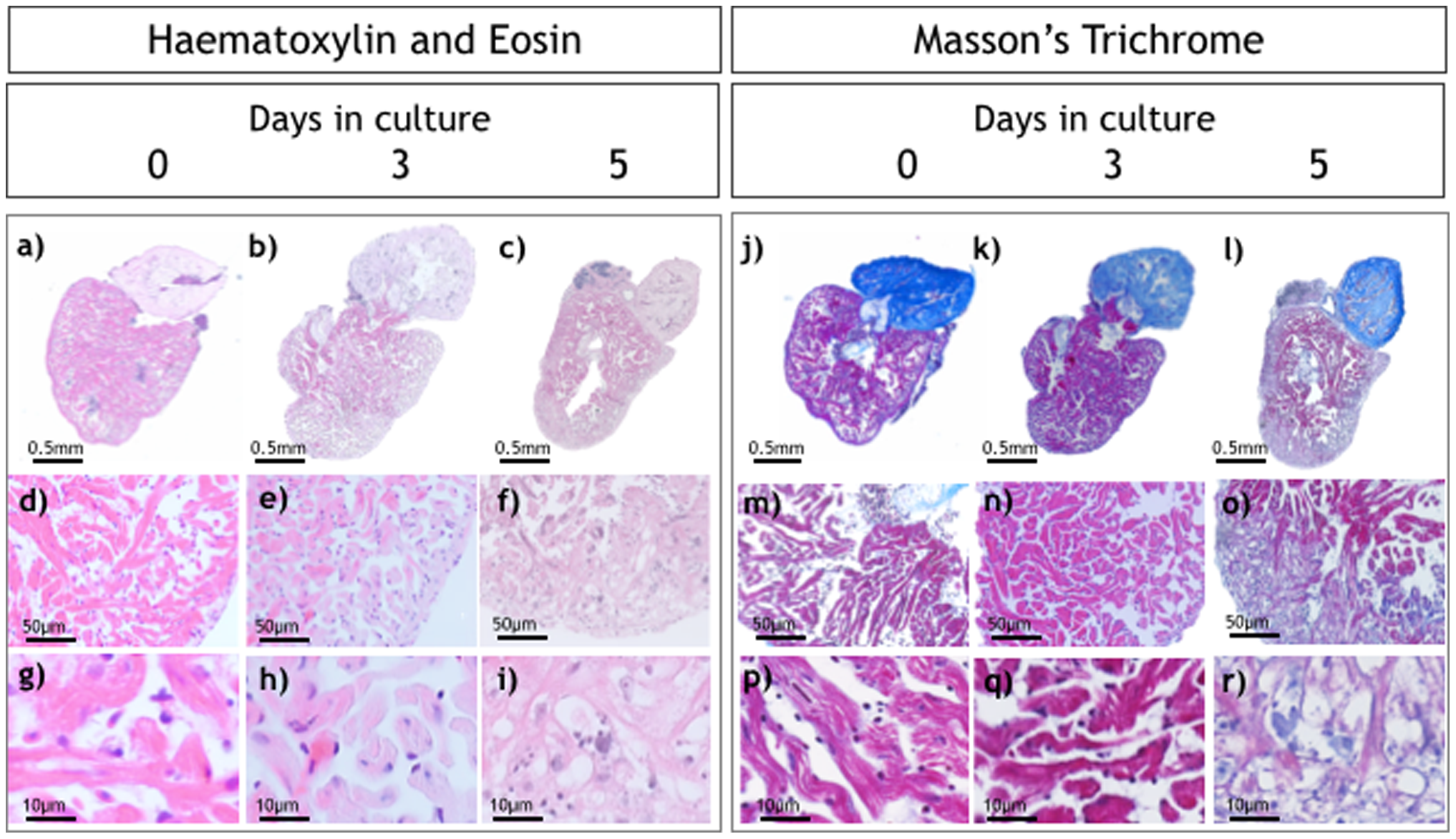 Haematoxylin and Eosin (H&E; a–i) and Masson’s trichrome staining (j–r) of hearts at 0, 3 and 5 days in culture. Higher magnification images (g, h, i) show normal cellular architecture at day 0 and day 3 with significant changes at day 5.