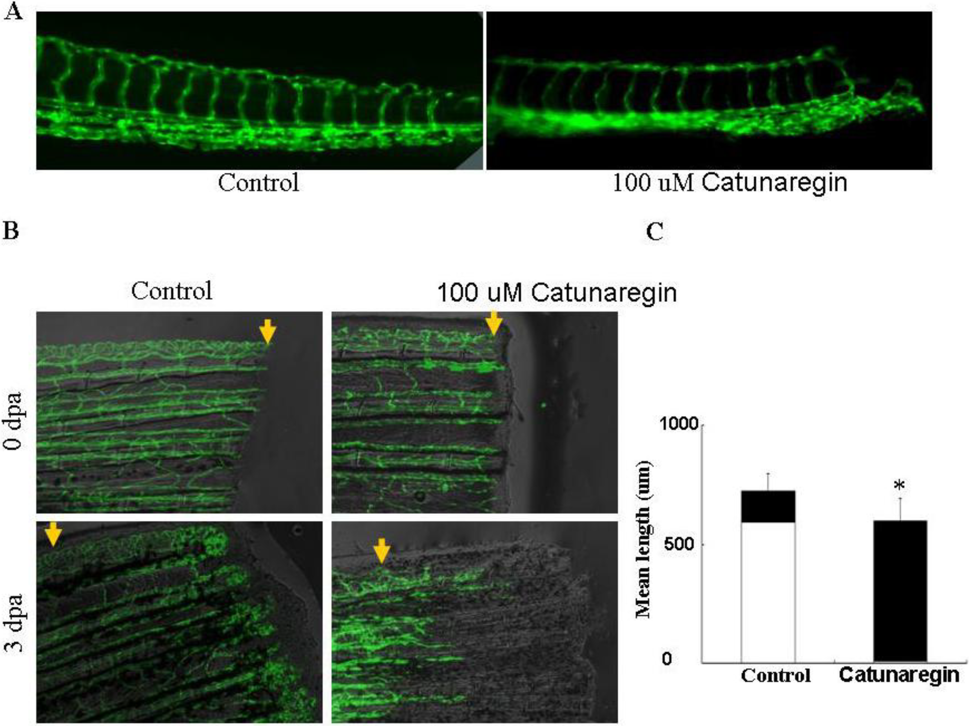 Inhibition of the zebrafish neovascularization by catunaregin. (A) Live fluorescent zebrafish embryo assay. Transgenic TG (fli1:EGFP) zebrafish embryos, which show green fluorescent protein (GFP) expression in endothelial cells, were incubated for 72 h without or with 100 μM catunaregin. (B) Caudal fin regrowth is limited by angiogenesis. The same fins are shown in bright field (top panels) and with the corresponding endothelial-eGFP signal (bottom panels). Zebrafish tail fins were clipped, then allowed to recover normally or treated with catunaregin as indicated. (C) Quantitative comparison of vessel and fin regeneration in control and catunaregin-treated fish. Black bars, nonvascularized fin tissue; white bars, vascularized tissue. Average values are plotted for fin and vessel growth (n = 15) (* catunaregin vs. control, p < 0.01).
