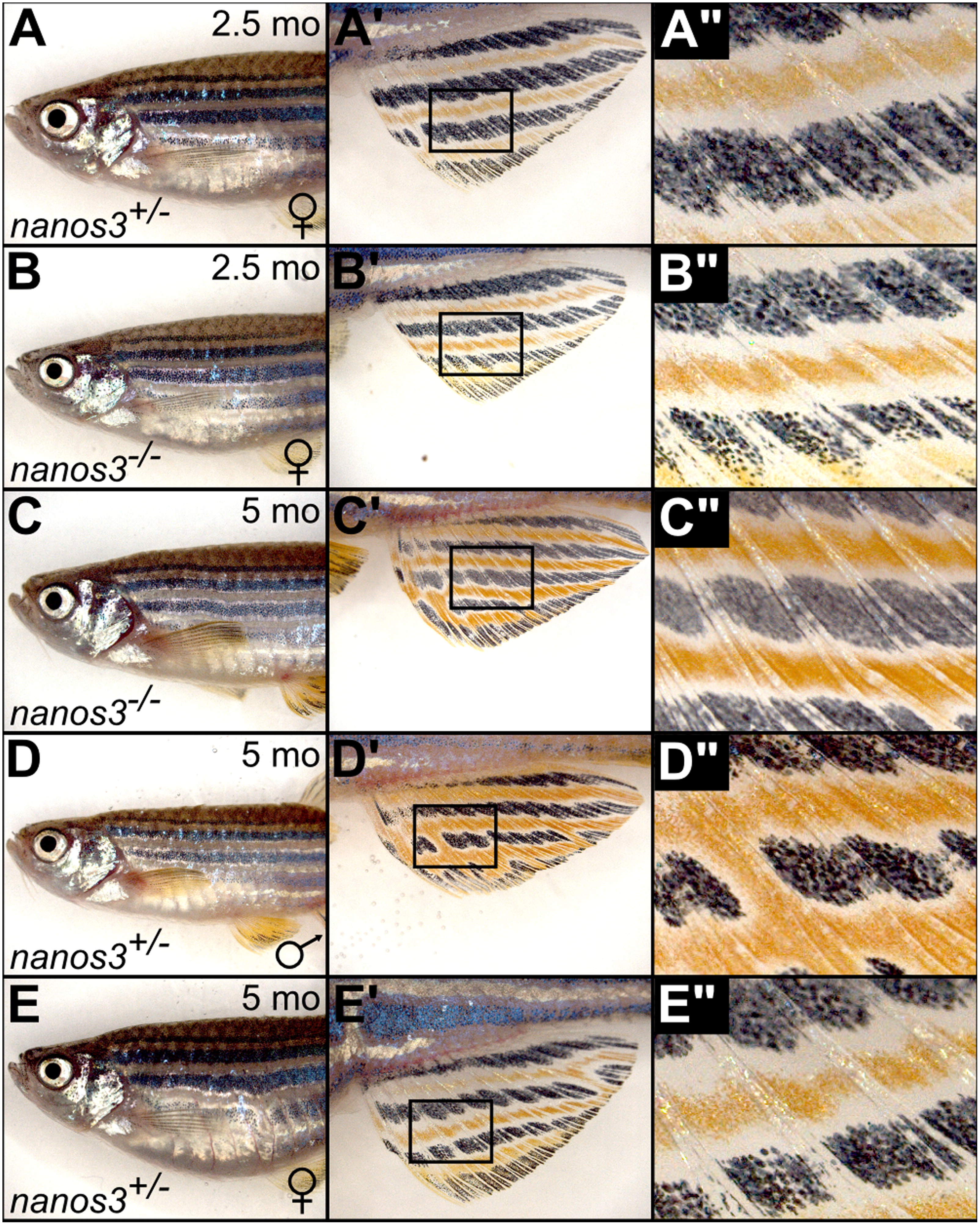 Fig. 1 Phenotypic sex reversal of nanos3 -/- 1° females correlates with loss of oocytes. (A-A′′) Representative 2.5 month old (mo) nanos3 +/- female control. (B-B′′) nanos3 -/- 1° female with large, egg-filled abdomen and light yellow fin pigmentation characteristic of control females. (C-C′′) Representative 5 mo nanos3 -/- 1° female. (D-D′′) Representative 5 mo nanos3 +/- male control. (E-E′′) Representative 5 mo nanos3 +/- female. At 5 mo, nanos3 -/- 1° females (C) have slim bodies and darker yellow fin pigmentation characteristic of control males (D). (A-E) Low magnification pictures showing anterior body. (A′-E′) Higher magnification picture showing anal fin. (A′′-E′′) magnified view of regions boxed in A′-E′. See also Fig. S1.