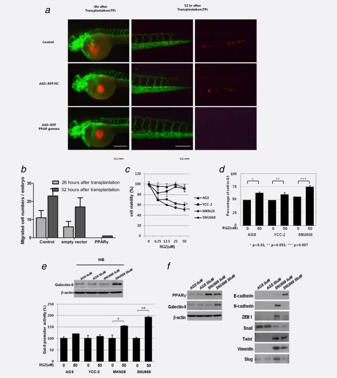 Fig. 4 Overexpression of PPARγ blocks gastric cancer cell migration in a zebrafish xenotransplantation model, and PPARγ agonists reduce gastric cancer cell viability, induce cell cycle arrest and affect EMT. (a) At 4 hr post-transplantation (hpt), the transplanted AGS cells with red fluorescence transfected with lentivirus containing LacZ or PPARγ were located in the center of yolk sac of living transgenic zebrafish embryonic vessels are visualized with green fluorescence. 52 hpt, both control and LacZ-containing AGS cells migrated into trunk or tail region, while no PPARγ -overexpressing AGS cells had migrated to the trunk area. (b) Histogram of the number of migrated cells per embryo. (c) The effect of various concentrations of rosiglitazone on cell viability (MTT assay) of AGS, MKN28, SNU601 and NU668 cell lines. Rosiglitazone inhibited cell viability in a dose-dependent manner in MKN28 and SNU 668 cells, in which PPARγ is well expressed, but minimally affected cell viability in AGS and YCC-2 cells, in which PPARγ is poorly expressed. (d) The effect of 50 µM rosiglitazone on cell cycle of AGS, YCC-2 and SNU668 cells. *p < 0.05, **<Rosiglitazone arrested the cell cycle at G0–G1 phase in all cell lines. Cell cycle arrest in SNU 668 cells, in which PPARγ is well expressed, is more prominent than in AGS or YCC-2 cells and in which PPARγ is poorly expressed. (e) This effect occurred through galectin-9 activation; galectin-9 luciferase activity was increased after rosiglitazone treatment in MKN 28 and SNU668 cell lines (*p < 0.05 vs. control, **p < 0.01 vs. control and ***p < 0.001 vs. control). (f) Rosiglitazone (50 µM) induced the expression of galectin-9, not affecting the expression of PPARγ , increased the expression of E-cadherin and reduced the expression of N-cadherin, ZEB1, vimentin and slug in Western blotting in SNU 668 cells.