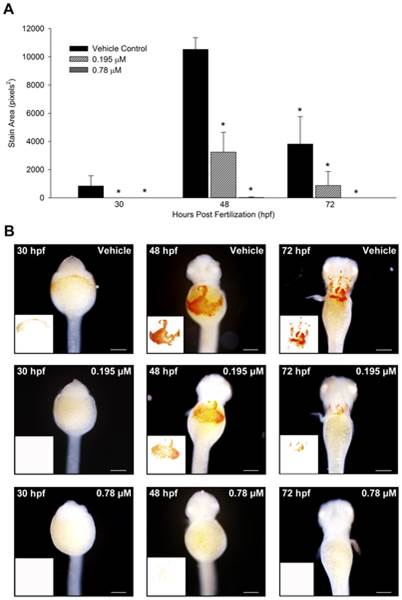 All embryos were oriented in dorsal recumbency for imaging. An asterisk denotes a significant difference from vehicle controls (p<0.05). White boxes represent stained areas within representative images. Scale bar = 200 µm.