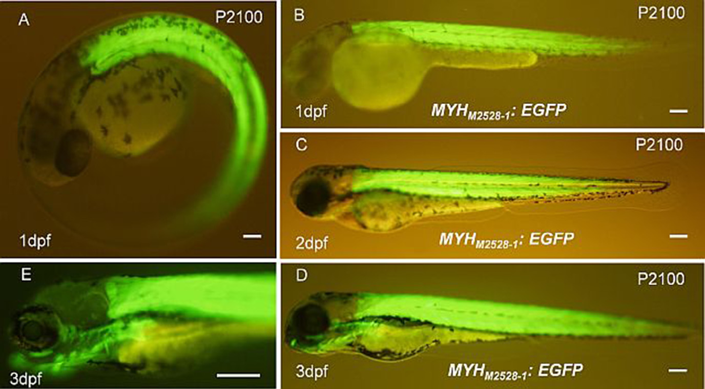 Expression patterns of EGFP in theTg:MYHM2528-1:EGFP stable transgenic line embryo and larva. A stable line was established by injecting the P2100 construct. EGFP expression was observed in the whole myotomal region at 1dpf (A,B), 2dpf (C), and 3dpf (D). In addition to myotomal skeletal muscle, the craniofacial muscle also expresses EGFP at 3dpf (E). Scale bars: 100 µm.