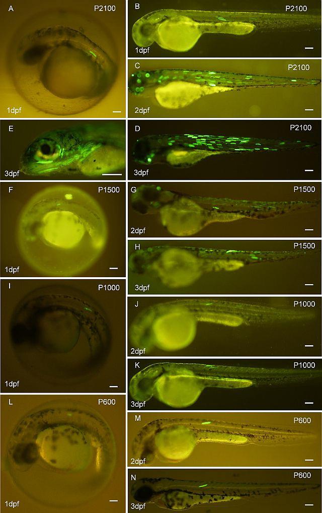EGFP expression patterns in the myotomal region of the zebrafish embryo (1 dpf, A, B) and larva (2 dpf, C; 3dpf, D) injected with the P2100 reporter construct. (D, E) EGFP expression patterns in craniofacial muscles in zebrafish larvae at 3 dpf. As well, zebrafish embryo (1 dpf, F), (1 dpf, I), (1 dpf, L) and larva (2dpf,G; 3dpf,H), (2dpf, J; 3dpf,K), (2dpf,M; 3dpf,N) injected with P1500, P1000, P600 reporter constructs, respectively. Scale bars: 100 µm.