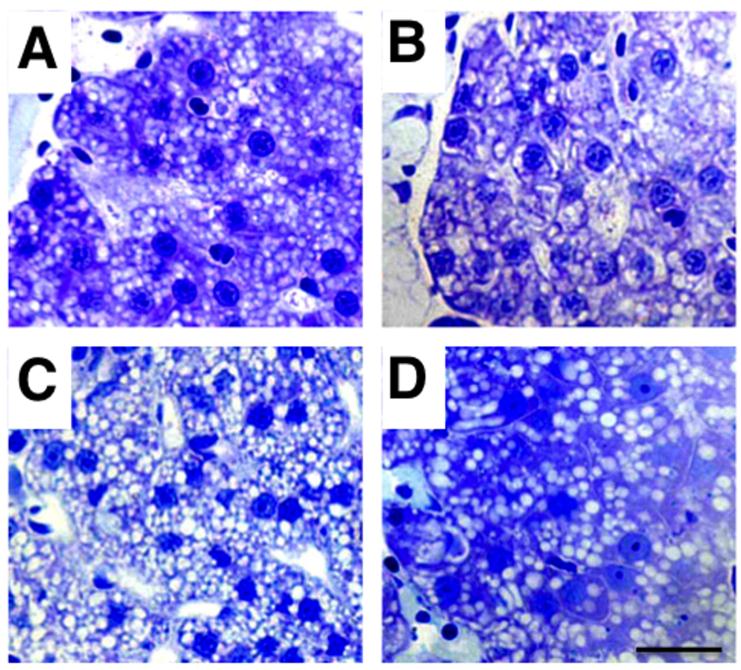 Fig. S13 Liver structure is not altered in acute organophosphorus poisoning in zebrafish. Normal hepatic structures and normal hepatocytes are observed both in 8 days post-fertilization control (A), grade 1 (B), grade 2 (C) and grade 3 (D) zebrafish larvae. Hepatocyte nuclear size may not be homogeneous in the same fish and darker nuclei in D correspond to erythroblasts/erythrocytes. The presence of lipid droplets (white spherical structures) is a normal observation corresponding to yolk remnants, and their number may not always be homogeneous in fish from the same batch. Scale bar: 80 µm.