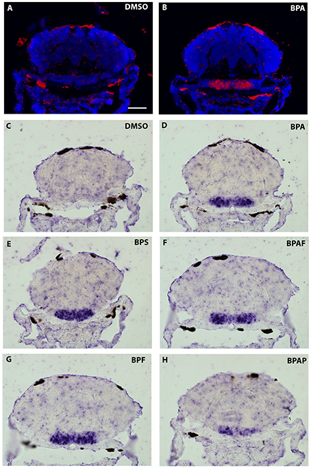 In situ expression of cyp19a1b at the level of the caudal hypothalamus (7-dpf old larvae) after treatments with various BPA analogs (E-H) and comparison with negative (A,C) and positive (B,D) controls.