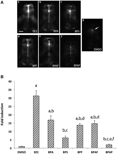 (A) In vivo imaging of 4-dpf old live transgenic cyp19a1b-GFP zebrafish larvae exposed to EE2, BPA, and various bisphenol A analogs.For each chemical the concentration used is 1 µM excepted for EE2 (1 nM) and the vehicle (DMSO). Dorsal views of the brains. Anterior is to the top. Bar = 20 µm. (B) Quantification of GFP fluorescence in zebrafish larvae exposed to the various compounds. Results are expressed as fold induction above control. Data re presented as mean ± SEM of 20 specimens per condition (n = 20). a: p < 0.05 vs. DMSO; b: p < 0.05 vs. EE2, c: p < 0.05 vs. BPA, d: p < 0.05 vs. BPS, e: p < 0.05 vs. BPF, f: p < 0.05 vs. AF.