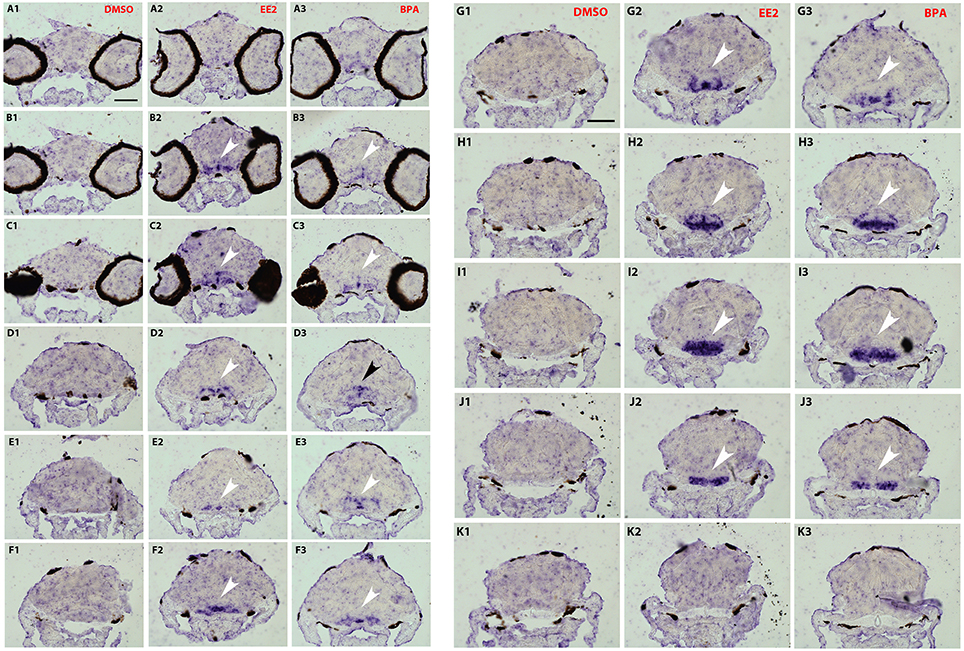 Distribution of cyp19a1b transcripts in 7-dpf old zebrafish brains after treatments with EE2 (A2-K2) and BPA (A3-K3) and compared to the DMSO control (A1-K1). Images of transverse sections through the rostrocaudal axis of brains. Arrowheads highlight areas of labeling. For all images, dorsal is to the top. Scale bar = 50 µm.