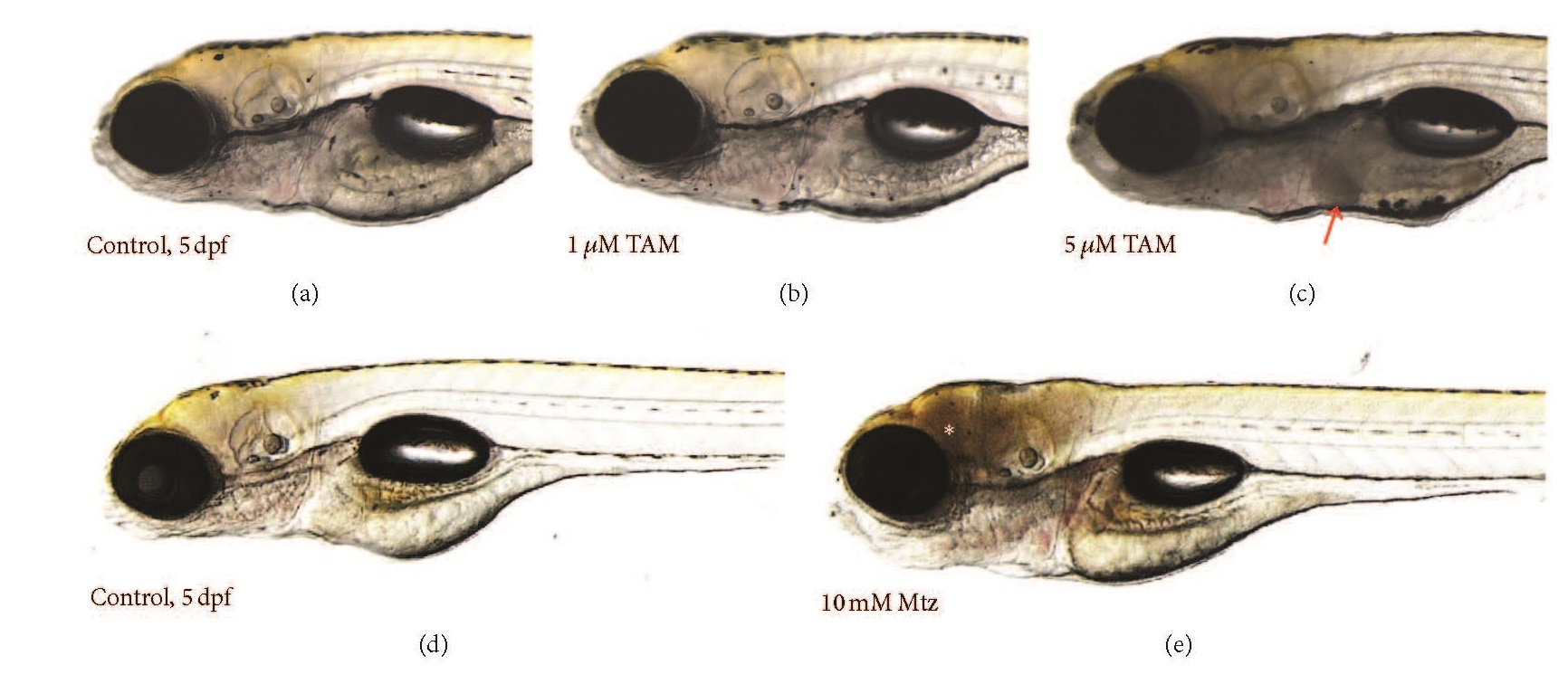 Tissue-specific cell death in the zebrafish larvae treated with tamoxifen (TAM) or metronidazole (Mtz). (a) 0.1% DMSO-treated control (5 dpf) and (b) 1 µM and (c) 5 µM TAM-treated zebrafish larvae. (d) 0.1% DMSO-treated control (2 dpf) and (e) 10 mM Mtz-treated zebrafish larvae. Liver-specific cell death was visualized by reduction of transparency in the TAM-treated zebrafish larvae (red arrow), compared to brain-specific cell death in the Mtz-treated larvae (white asterisk). For Mtz experiments, the transgenic zebrafish system, having neuron-specific nitroreductase expression, was used [20].