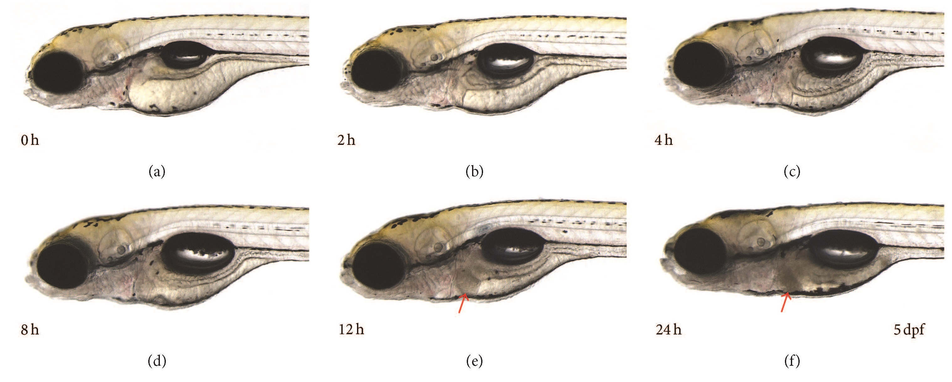 Duration-dependent changes induced by exposure to 5 ยตM tamoxifen in zebrafish larvae. (a) Pretreatment at 4 dpf and (b) 2-hour exposure, (c) 4-hour exposure, (d) 8-hour exposure, (e) 12-hour exposure, and (f) 24-hour exposure. After 12 hours, tamoxifen induced cell death in zebrafish larvae liver.