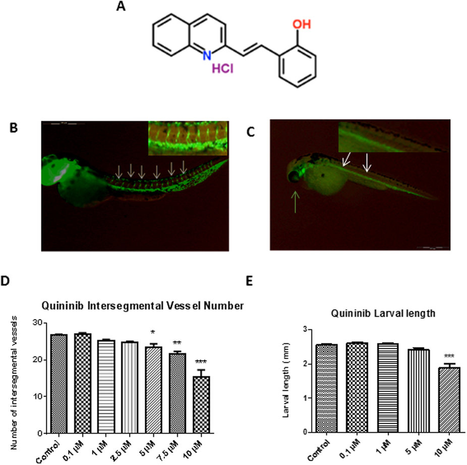 (A) Chemical structure of 2-[(E)-2-(Quinolin-2-yl) vinyl] phenol (quininib). (B,C) Representative images of larvae treated with vehicle control (B) and 10 μM quininib (C). The white arrows in (C) demonstrate the absence of ISV and the green arrow shows the presence of pericardial oedema and magnified views of ISVs are inset in the right upper corner of each panel. (D) Quininib reduced ISV number at 5 μM (12%), 7.5 μM (18.8%) and 10 μM concentration (33%). (E) Quininib reduced larval length at 10 μM. Error bars are mean + SEM. Statistical analysis performed by ANOVA and Dunnett’s multiple comparison test. N = 3 experiments with 10 embryos per concentration *p < 0.05, **p < 0.01, ***p < 0.001.