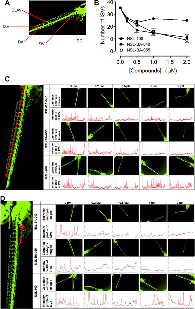 PCAIs disrupt the formation of zebrafish intersegmental vessels (ISVs) and subintestinal veins (SIVs). Transgenic (fli1: EGFP) Zebrafish embryos, 24 hpf were treated with NSL-BA-040, NSL-BA-055 and NSL-100 for 48 h and imaged as described in the methods. (A) Zebrafish anatomic regions highlighting angiogenesis targets: intersegmental vessels (ISV), dorsal longitudinal anastomotic vessel (DLAV), dorsal aorta (DA), subintestinal vein (SIV) and duct of cuvier (DC). (B) Zebrafish ISVs plots of the means ± SEM, N = 6–8. Significance (**p < 0.01 and ***p < 0.001). (C) and (D) Representative images and intensity profiles of zebrafish ISV and SIV, respectively depicting the effect of the compounds. The peak analysis for each compound was fixed based on the intensity of its untreated control.