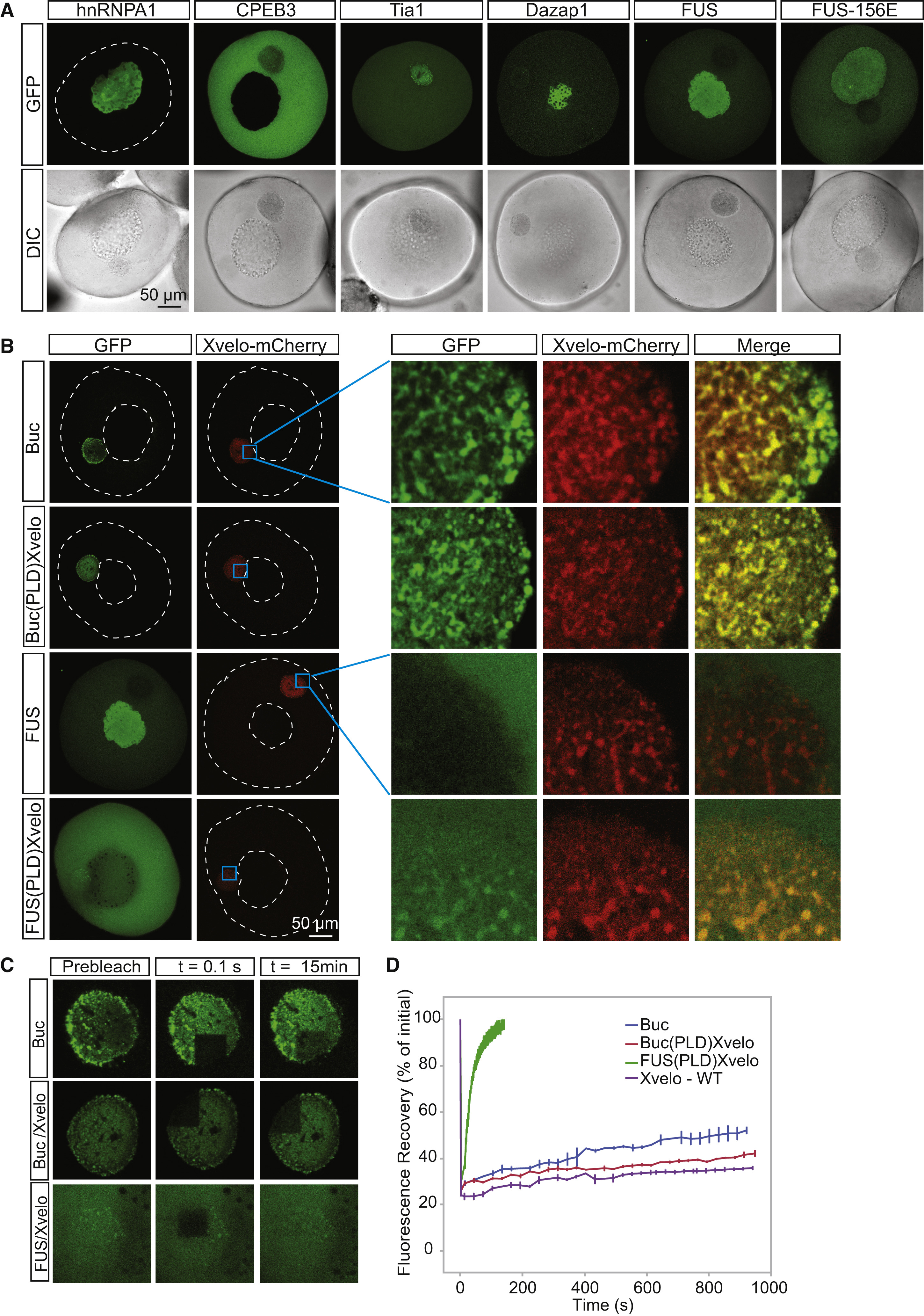 (C) Internal rearrangement of fluorescent Bucky ball-GFP (Buc), and PLD-swap versions of Xvelo, Buc(PLD)Xvelo-GFP and FUS(PLD)Xvelo-GFP, after photobleaching over time.