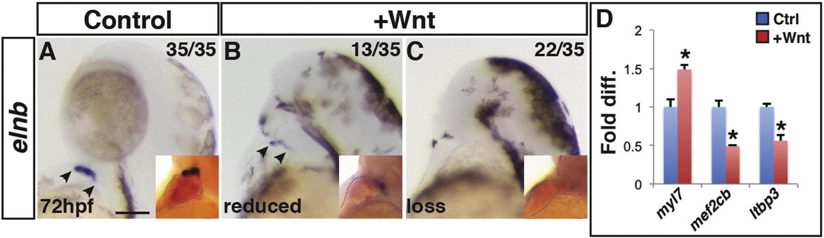 Increased Wnt signaling promotes loss of the SHF. (A–C) Control sibling embryos and embryos after increased Wnt signaling at the SP stage. Increasing Wnt signaling prior to gastrulation leads to loss of the SHF-derived OFT smooth muscle (elnb). Inserts indicate embryos with two-color ISH for myl7 and elnb. Outlines indicate the hearts. (D) RT-qPCR for cardiac differentiation and SHF progenitor marker expression at 24 hpf. Increasing Wnt signaling prior to gastrulation promotes increased expression of the pan-cardiac differentiation marker myl7 and decreased expression of the SHF markers mef2cb and ltbp3 compared to WT sibling controls. Images are lateral views with anterior upward. Scale bar indicates 100 μm.
