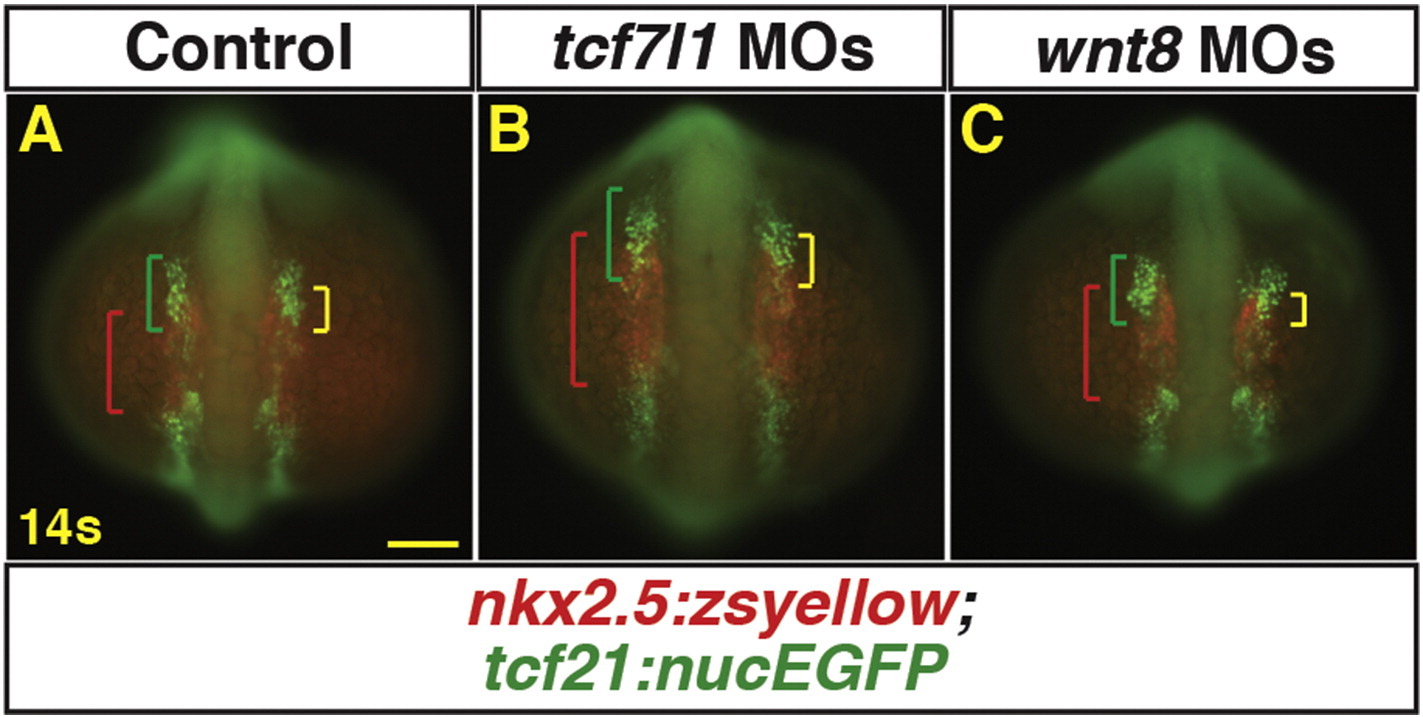 Manipulation of Wnt signaling affects the overlap of cardiac and pharyngeal muscle progenitor markers. (A–C) Tg(nkx2.5:ZsYellow);Tg(tcf21:nucEGFP) control, Tcf7l1 depleted, and Wnt8a depleted embryos at the 14 s stage. Tcf7l1 depletion expands the total anterior tcf21 + progenitor domain length (green brackets) as well as the overlapping expression (yellow brackets) within the ALPM. Green brackets - anterior tcf21+ progenitors. Red brackets - nkx2.5+ progenitors. ≥ 5 embryos were examined per condition. Yellow brackets – regions of overlap between tcf21+ and nkx2.5+ domains. Scale bar indicates 100 μm.