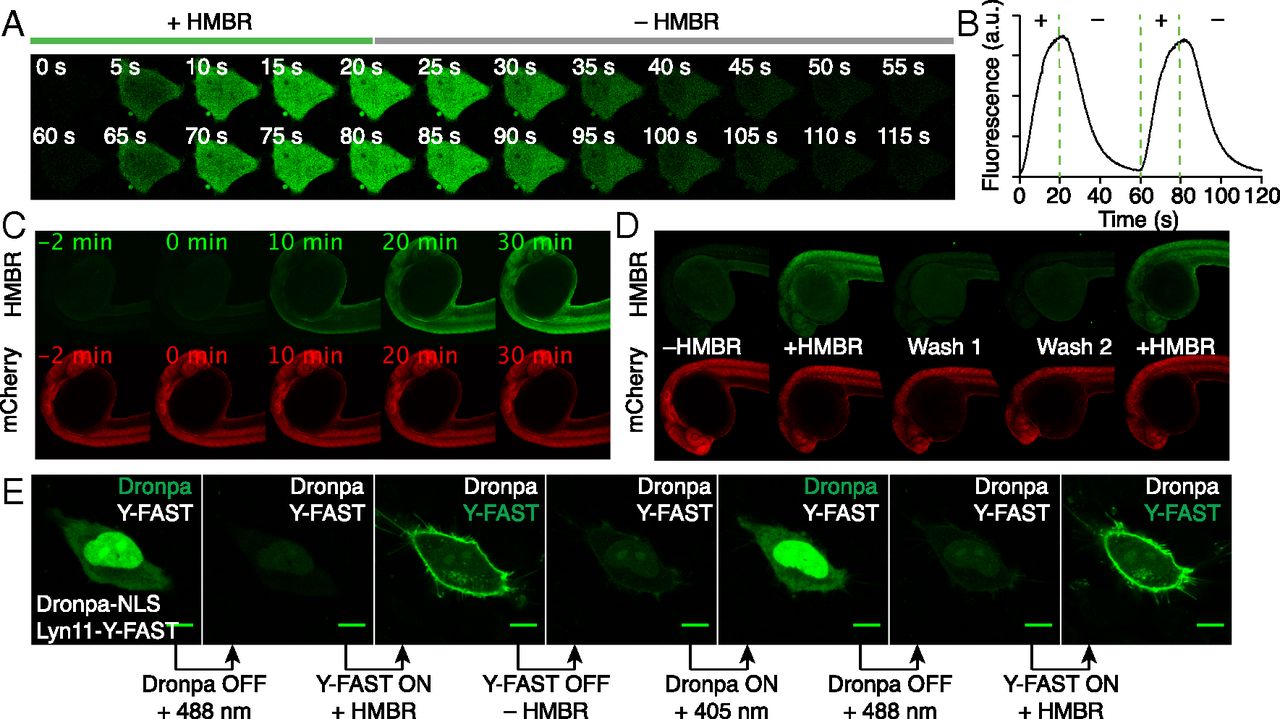 On/off fluorescence switching by iterative labeling/unlabeling. (A and B) HeLa cells expressing mCherry-Y-FAST were grown in a microfluidic channel and repeatedly incubated with HMBR-containing culture medium for 20 s and HMBR-free culture medium for 40 s. A multifunctional fluidic controller enabled several cycles of labeling/unlabeling. HMBR concentration was 5 μM. (A) Confocal time lapse showing two cycles of labeling/unlabeling (Ex/Em 488/493–575 nm). Movie S2 shows 10 cycles of labeling/unlabeling. (B) Temporal evolution of the cell fluorescence upon addition (+) and removal (–) of HMBR. (C) Confocal time lapse showing the labeling kinetics in a zebrafish embryo expressing Y-FAST and mCherry (HMBR channel: Ex/Em 491/525–539 nm; mCherry channel: Ex/Em 561/605–664 nm). HMBR concentration was 10 μM. See also Movie S3. (D) A zebrafish embryo expressing Y-FAST and mCherry was imaged before addition of HMBR (–HMBR), 20 min after incubation with 10 μM HMBR (+HMBR), after two washings of 20 min (Wash 1 and 2), and after reincubation with 10 μM HMBR (+HMBR). (E) Confocal micrographs of live HeLa cells expressing Dronpa−NLS (nucleus) and lyn11−Y-FAST (membrane) showing sequential imaging of nuclear Dronpa and membrane-anchored Y-FAST through sequential on/off labeling of Y-FAST intercalated with on/off photoswitching of Dronpa (Ex/Em 488/493–797 nm). HMBR concentration was 5 μM. (Scale bars, 10 μm.)
