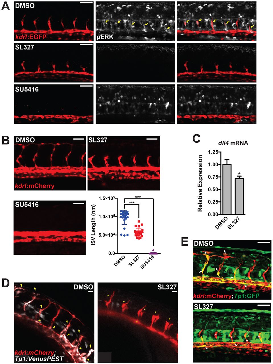 Active MAPK/ERK signaling regulates sprouting angiogenesis in zebrafish. (A) pERK staining (white) in embryos treated with vehicle (i.e. DMSO), MEK (i.e. SL327) or VEGFR2 (i.e. SU5416) inhibitors [treated from 18-20 hours post-fertilization (hpf) to ∼24 hpf]. See Fig. S2A for additional images and quantification. Yellow arrows indicate pERK-positive sprouting endothelial cells. (B) Inhibition of MEK activity by SL327 inhibits ISV sprout length. Inhibition of VEGFR2 signaling with SU5416 is included as a positive control. Quantification of ISV length at 28 hpf is shown. (C) dll4 expression in SL327-treated embryos at 28 hpf (treatment initiated at 18-20 hpf) as assessed by qRT-PCR (n=6 individual embryos). (D) Notch activity is reduced in the vasculature of SL327-treated Tg(kdrl:mCherry); Tg(Tp1bglob:Venus-PEST) embryos. Still images from time-lapse microscopy of a representative experiment are shown. Arrows indicate Notch signaling-positive ISVs, arrowheads indicate Notch signaling-positive endothelial cells in the dorsal aorta, asterisks indicate Notch-negative ISVs. See Fig. S3 (for additional still images) and Movies 1 and 2. (E) Similar experiment to that shown in D, but with Tg(kdrl:mCherry); Tg(Tp1bglob:EGFP) embryos. Scale bars: 50 μm (A,B,E); 20 μm (D).
