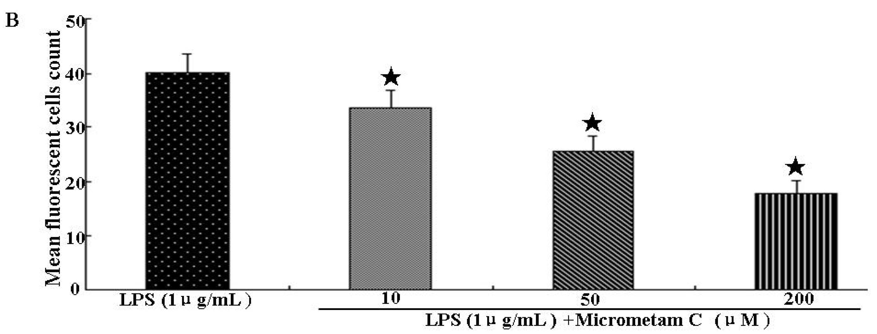 Effect of micrometam C in inflammation-induced zebrafish model by tail-cutting. Experiments were performed in triplicate and the data are expressed as mean ± SEM. Fluorescent cells count are significantly different at p < 0.05 as analyzed by ANOVA. (* p < 0.01 vs. LPS).