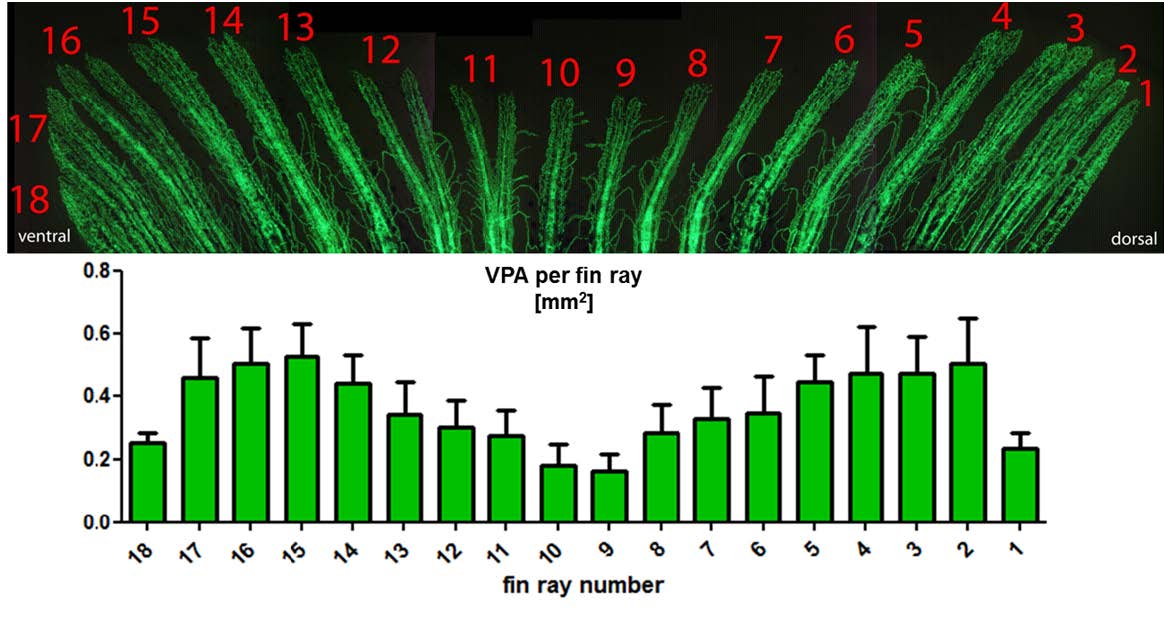 Stereology allowed quantification of absolute values for various parameters from individual fin rays. This can be very important to reduce the area of interest to specific sites. In this example, the fin rays were numbered from dorsal to the ventral aspect.