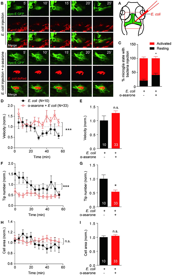 α-asarone affects microglial morphological dynamics in vivo. E. coli was inject into the gap the optic tectum region (A) of the transgenic Tg(Apo-E:eGFP) zebrafish. Time-lapse images were taken at 5-min intervals (B). Zebrafish pre-incubated with α-asarone showed decreased activation, n = 3 (C). The pre-treatment did not cause significant effect to the average migration velocity (E), but the dynamics of velocity change was significant (D). Results were normalized to “0 min” value. α-asarone treatment resulted significant declines in both dynamical changes and average numbers of tips (F,G). α-asarone treatment did not affect the cell area (H,I). (*p < 0.05, unpaired two-tailed Student t-test for independent data comparison vs. E. coli injection; ***p < 0.001, two-way ANOVA for group comparison between the dynamical trends, the numbers were on the bars).