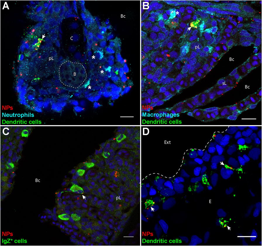 Poly(lactic acid) nanoparticles (PLA-NPs) are accumulated in mucosal antigen-presenting cells. (A–D) Representative confocal images of gills (A–C) and skin (D) of wild-type adults immersed for 24 h in 0.01% fluorescent PLA-NPs (red). Images were acquired from 40-μm-thick whole-body cryosections, stained for neutrophils (Mpx-positive, cyan) (A), macrophages (Mpeg1-positive, cyan) (B), IgZ+ B-cells (green) (C), and dendritic cells (DCs) (PNA, green) (A,B,D), in addition to nuclei (DAPI, blue). Maximal intensity projections from 3 (A–C) or 5 (D) optic sections acquired every micrometer. Nanoparticle (NP) accumulations are observed in gill DCs [(A,B), arrows], macrophages [(B), star], and IgZ+ cells [(C), arrow], while no NP are detected in neutrophils [(A), stars]. NPs are also taken up by a network of skin DCs [(D), arrows]. pL, primary lamellae; sL, secondary lamellae; Bc, branchial cavity; B, blood; C, cartilage; Ext, external environment; E, epidermis. Scale bar: 10 μm.