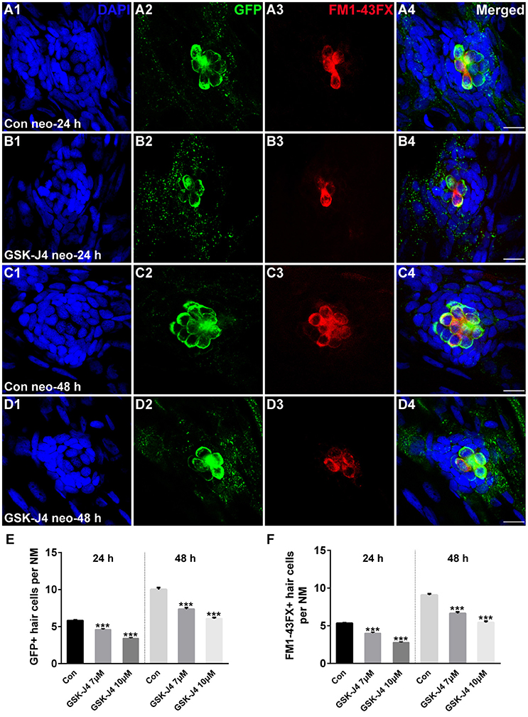 GSK-J4 impaired hair cell regeneration after neomycin damage. (A–D) GSK-J4 reduced the numbers of GFP-positive (green) and FM1-43FX-positive (red) hair cells compared with DMSO-treated controls. Scale bars = 10 μm. (E,F) Quantitative analysis of the number of GFP-positive (E) or FM1-43FX-positive (F) hair cells per neuromast (NM) at different time points in DMSO-treated control and GSK-J4-treated larvae. In the 24-h group, n = 40 neuromasts (20 larvae) per group; in the 48-h group, n = 28 neuromasts (14 larvae) per group. ***p < 0.0001. Bars are mean ± sem. [24-h group: One-way ANOVA; GFP-positive cells: F(2, 117) = 96.94; FM1-43FX-positive cells: F(2, 117) = 114. 48-h group: One-way ANOVA; GFP-positive cells: F(2, 81) = 88.96; FM1-43FX-positive cells: F(2, 81) = 93.85].