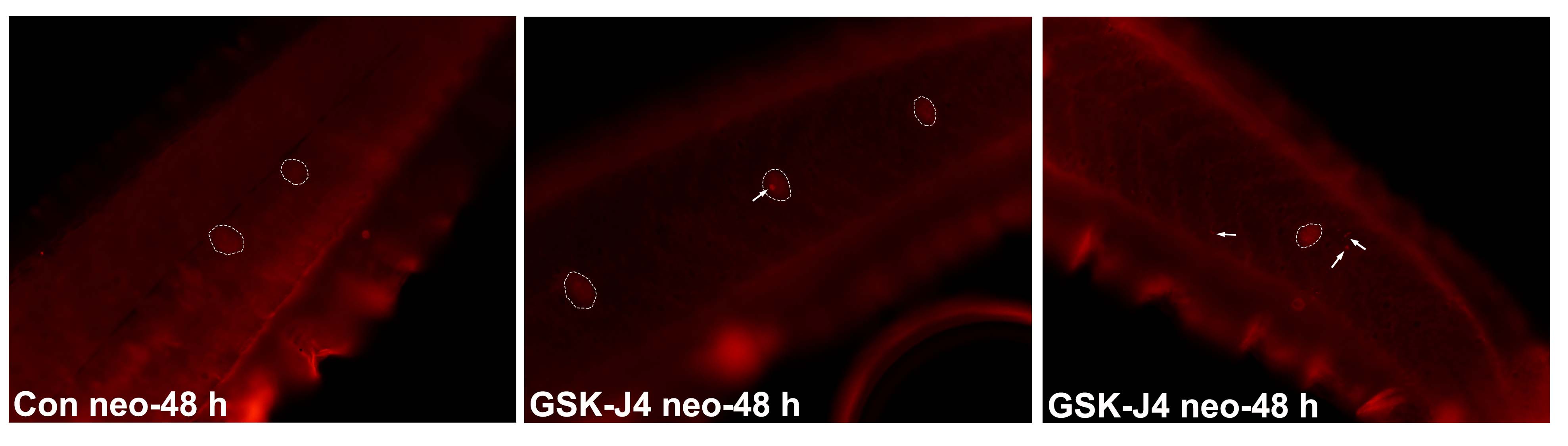 Effects of GSK-J4 on apoptosis in the zebrafish body. Detection of cell apoptosis by cleaved caspase-3 staining in the body of zebrafish larvae exposed to DMSO (Con) or 10 μM GSK-J4 at 48 h following neomycin damage. The cleaved caspase-3-positive cells are indicated by white arrows, and the neuromasts are outlined.