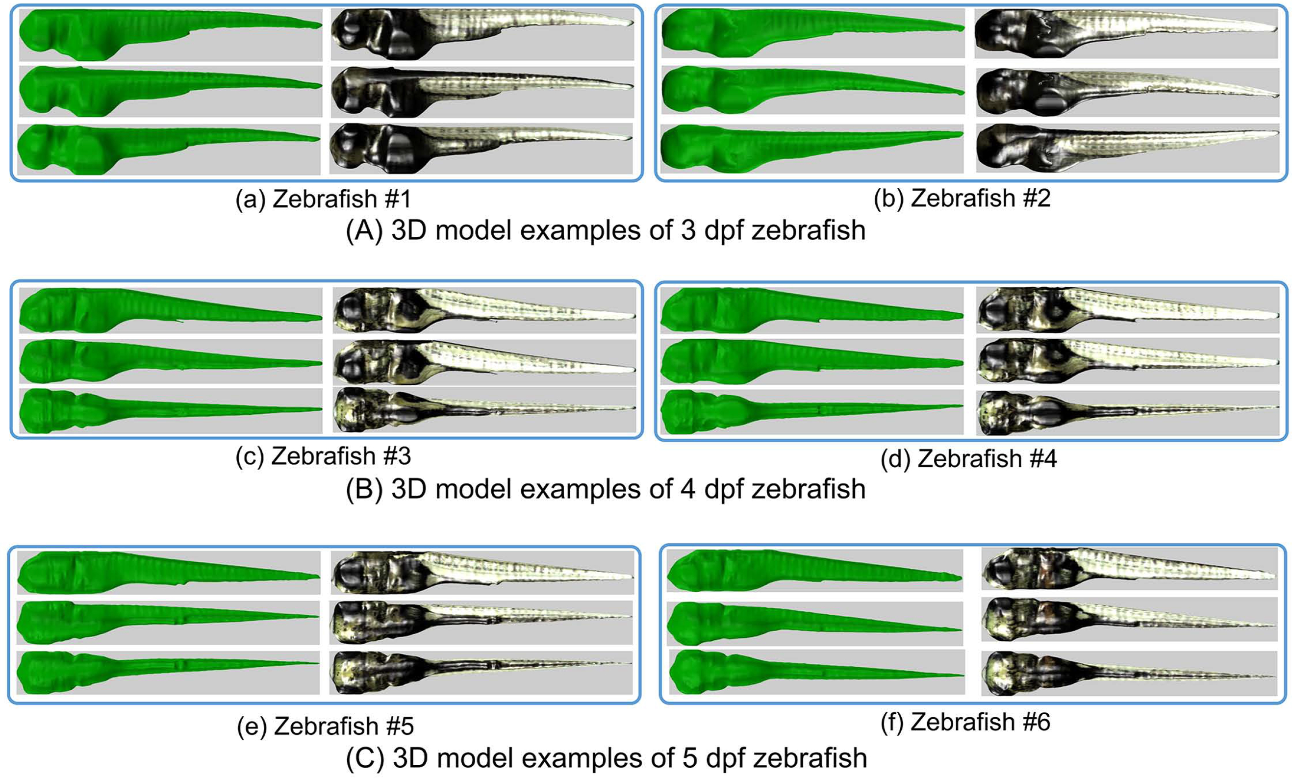 Visualization of 3D models of 3 zebrafish larval stages (3 dpf, 4 dpf and 5 dpf). Each box represents a reconstructed 3D model for one specific zebrafish larvae visualized from three different viewpoints. The 3D volumetric representations are shown in green on the left side in each box. The models with texture-mapping are in the right side of each box. (A) 3D models of two selected 3 dpf zebrafish larvae. (B) 3D models of two selected 4 dpf zebrafish larvae. (C) 3D models of two selected 5 dpf zebrafish larvae. Variation in size and shape between stages and within stages (interclass and intraclass) can be appreciated from the visualizations. A remarkable intraclass discrimination originates from the size and color of the yolk. In addition, animations of the 3D zebrafish models are available at: http://bio-imaging.liacs.nl/galleries/VAST-3Dimg/.