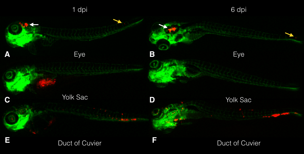 Fig. 1 Stereo fluorescence image of zebrafish embryos engrafted with CM cells (vasculature in green and CM cells in red). The embryos were injected at 2 dpf with CRMM-1 CM cells labeled with tomato-red (red). Photographs taken of the same embryo that had been injected with CM cells around the eye at 1 (A) and 6 dpi (B), showing cells inside the head (white arrows) and in the tail (yellow arrow). Following injection in the yolk sac, an embryo shows the cells in the yolk sac at 1 (C), but not 6 dpi (D). After injection of cells into the duct of Cuvier, cells are seen inside the circulation at 1 dpi (E), mainly in the tail and inside the eye. The same embryo shows a cluster in the tail and cells inside the eye at 6 dpi (F). The stereo fluorescent images (original magnification: ×20) are representative of >10 independent experiments.
