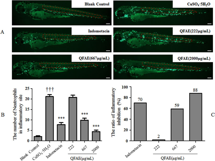 Effect of QFAE on inflammatory sites in CuSO4·5H2O-induced transgenic neutrophil fluorescent zebrafish. (A) Typical photos of neutrophils in inflammatory site of CuSO4·5H2O-induced transgenic neutrophil fluorescent zebrafish model after QFAE treatment. The green fluorescent spots are neutrophils, and the red area is a quantitative inflammatory site. The green fluorescent spots in the red area are the neutrophils of inflammatory site. Scale bar, 100 μm. (B) Effect of QFAE on neutrophil number in inflammatory site from CuSO4·5H2O-induced zebrafish model. ***P < 0.001 compared with that of model control group (CuSO4·5H2O), †††P < 0.001 compared with the blank control group. (C) Effect of QFAE on ratio of inflammatory inhibition in CuSO4·5H2O-induced zebrafish model.