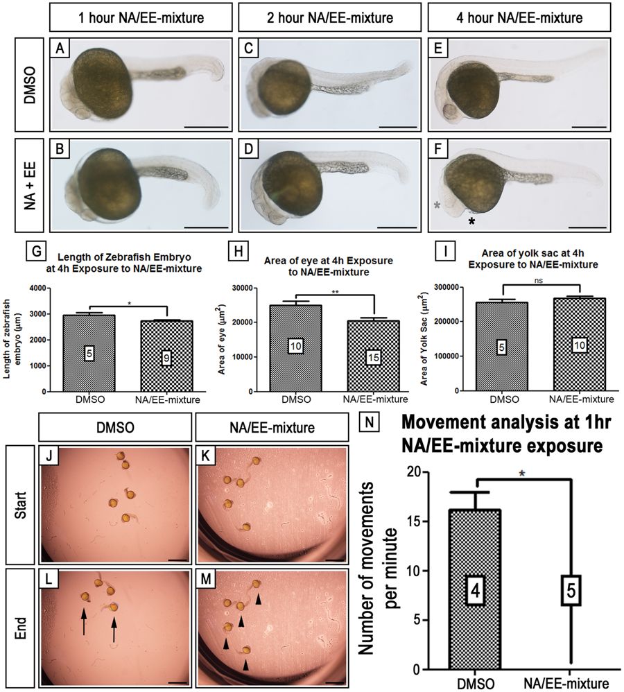 3 Embryonic damage is seen within 4 hrs of NA/EE-mixture exposure and embryonic movement is stunted from 1 hr of exposure. Zebrafish embryos at 24 hpf were treated with either DMSO (A,C,E) or NA/EE-mixture (B,D,F) for 1 hr (A,B), 2 hr (C,D) or 4 hr (E,F) before fixation. Overall body length, eye area and yolk sac area were measured. Embryos begin to show heart defects (n = 2/5) (black asterisk) and smaller body length (G) and eye area and pigment (H) (grey asterisk) by 4 hr exposure. At 4 hr, there is no change in the area of the yolk sac between DMSO control and NA/EE-mixture treated embryos (I). At 1 hr exposure, it was noted that there was a drastic decrease in movement in NA/EE-mixture treated embryos. This was determined using time lapse recording of embryos for 2 minutes and counting the number of times each embryo moved. The lack of movement can be visualised by comparing the starting and finishing positions of the embryos (J–M). In the DMSO treated well, there has been clear movement between 0 min (J) and 2 min (L), with one embryo having moved out of frame. Black arrows denote embryos in different positions. In comparison, the NA/EE-mixture treated embryos can be observed to have remained in the same position between 0 min (K) and 2 min (M). Black arrowheads show embryos in same position. The average number of movements recorded for DMSO treated embryos was 16 per minute compared to the average 0 per minute in the NA/EE-mixture treated embryos (N).