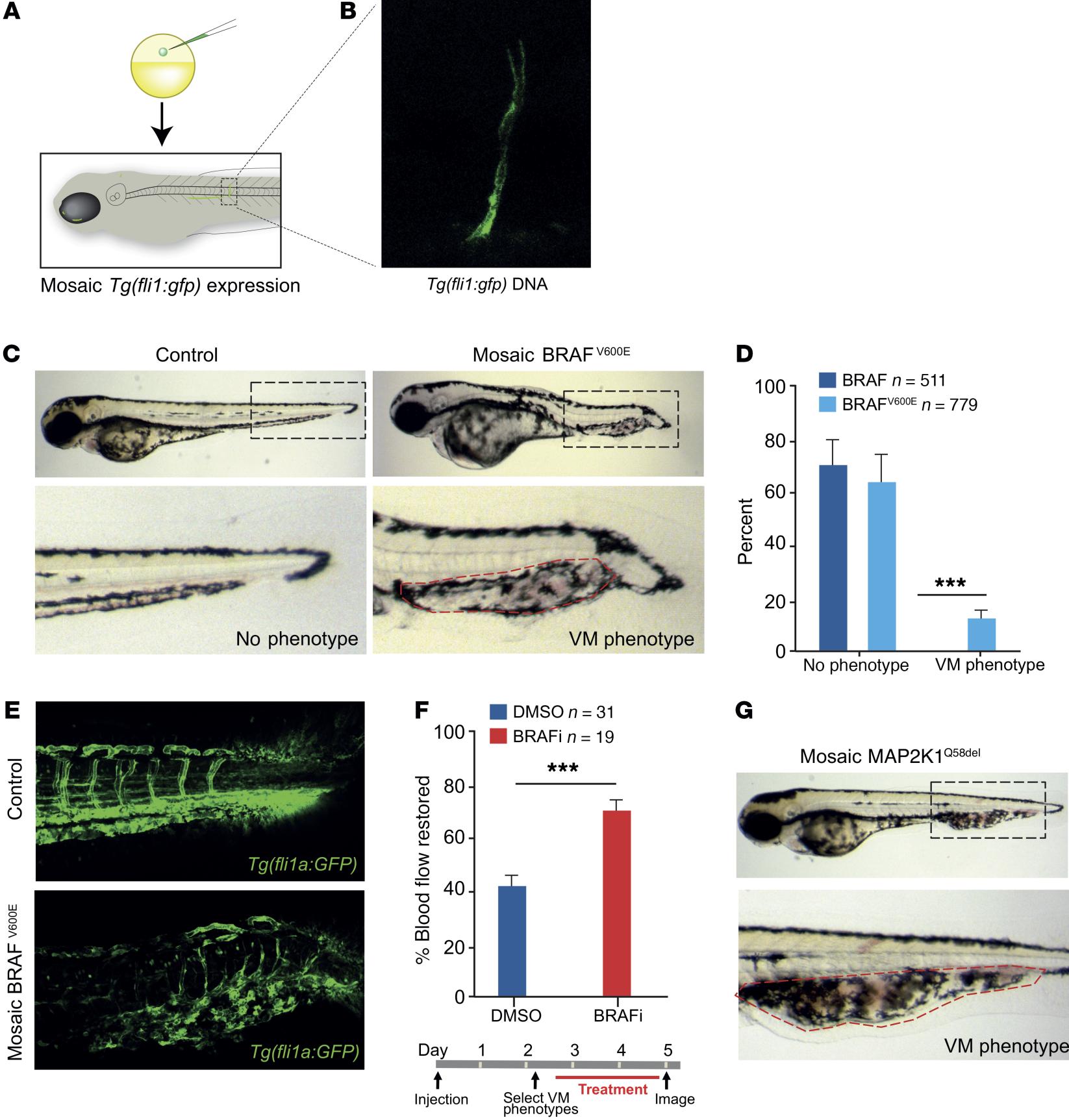 (A ) Schematic of zebrafish embryos injected with Tg (fli1a:GFP ) at the 1-cell stage generate zebrafish larvae that are mosaic for the transgene integration and expression. (B ) Image of mosaic expression of Tg (fli1a:GFP ) in a vessel. (C ) Images of zebrafish expressing WT or mutant BRAFV600E in a mosaic fashion from a fli1a promoter in endothelial cells. Accumulation of blood is visible at the caudal vein vascular plexus in the BRAFV600E–expressing zebrafish and outlined with a dashed red line. (D ) Quantification of VM phenotype in BRAFWT-expressing (n = 511) and BRAFV600E-expressing (n = 779) zebrafish. (E ) BRAFWT and BRAFV600E mosaic expression in stable Tg (fli1a:GFP ) larvae to visualize all vessels in the zebrafish in the VM lesion. Increased numbers of vascular channels and disorganized architecture of VM lesions are clearly detectable. (F ) Schematic of VM treatment protocol and quantification of the percentage of VM BRAFV600E zebrafish with improved blood flow following treatment with vemurafenib. VM BRAFV600E zebrafish were randomized prior to DMSO (n = 31) or vemurafenib (n = 19) treatment and blind scored. (G ) Images of zebrafish expressing MAPK2K1Q58del in a mosaic fashion from a fli1a promoter in endothelial cells (n = 5/37). Zebrafish larvae in D were analyzed by an unpaired parametric t test with Welch’s correction and in F by a paired t test comparing matched pairs (before and after treatment). Data are shown as SEM. ***P < 0.001.