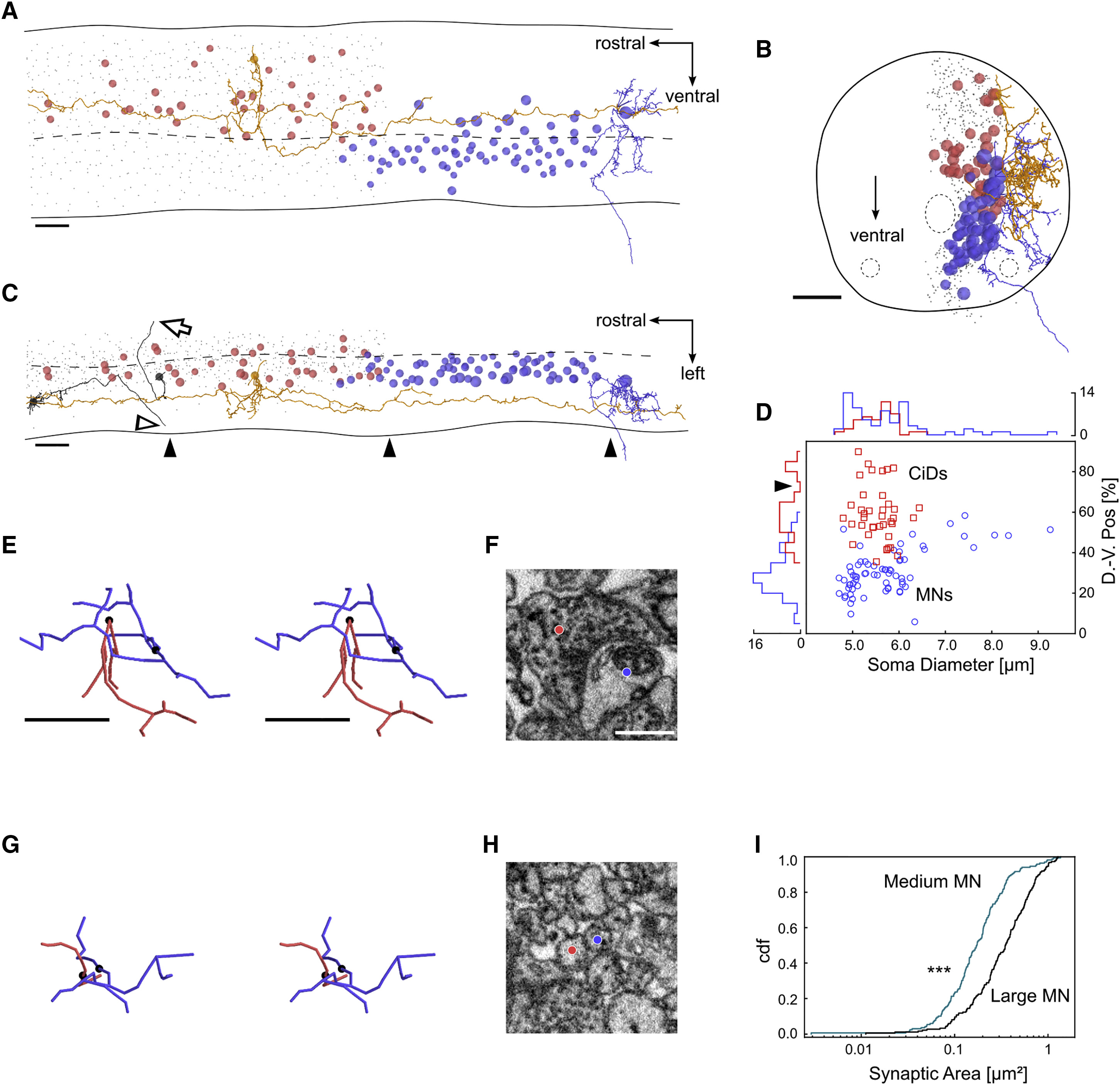 (E–H) Stereo-views of proximity location between a CiD axon (red) and an MN dendrite (blue), with (E) and without (G) an actual synapse. (F and H) corresponding cross-sections through EM data. Black spheres in (E) and (G) correspond to colored disks in (F) and (H).