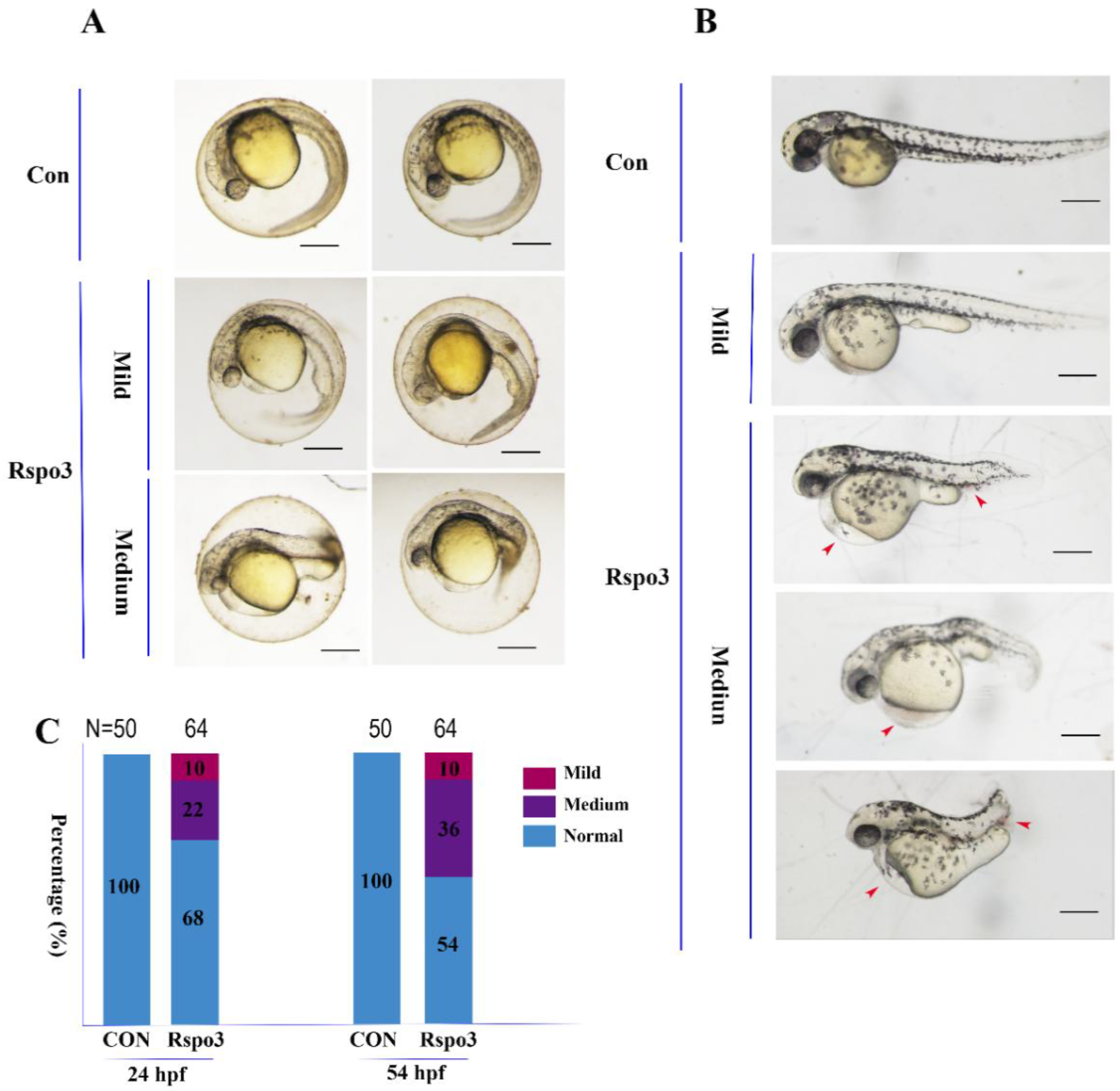 Overexpression of C. semilaevis Rspo3 affects Danio rerio embryo development. An amount of 1000 pg/embryo of C. semilaevis Rspo3 mRNA was injected into AB strain D. rerio embryos at 1–4 cell stages. All embryos are shown with anterior to the left. Scale bar = 200 μm. (A) Classification of phenotypes at 24 h post-fertilization (hpf); (B) Classification of phenotypes at 54 hpf. The red arrowheads indicate ecchymosis; (C) The percentages of embryos in each category as shown in (A) and (B); N is the number of total samples analyzed in each group.