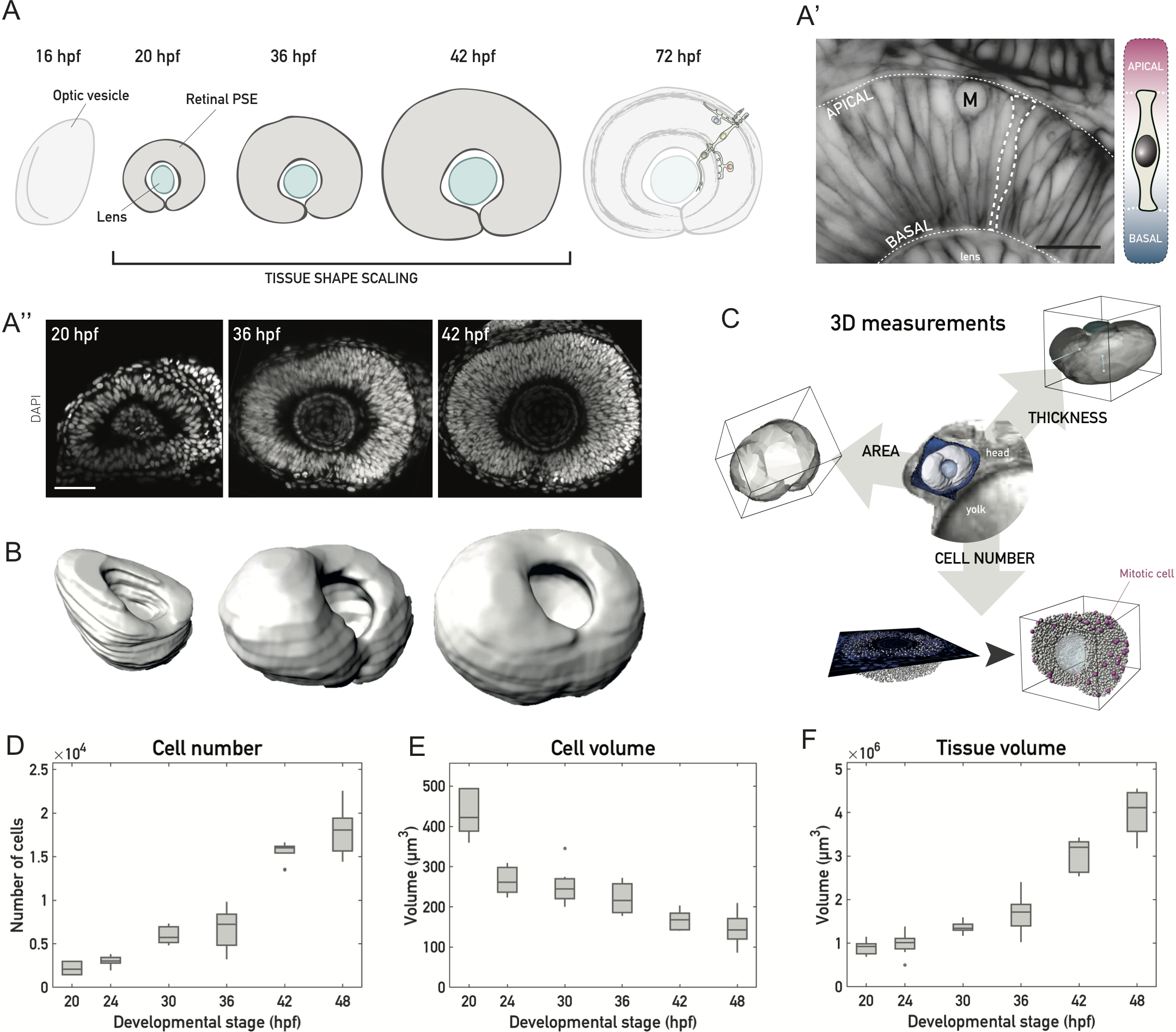 (A) Schematic of vertebrate retinal development. After the optic vesicle forms the optic cup, cells in the retinal PSE proliferate as the tissue maintains its shape (20–42 hpf) to ultimately give rise to the laminated neuronal retina. (A’) The developing vertebrate retina is a PSE. Left: Optical slice through the retinal PSE at approximately 30 hpf, with a single cell outlined (dashed white line). Apical and basal surfaces of the tissue are outlined (dashed white lines). Cell membranes are labeled by Tg(actb1::HRAS-EGFP). Scale bar: 20 μm. Right: Schematic of a cell in the retinal PSE. The apical endfoot is shown at the top, the basal endfoot at the bottom (thin white dashed lines). (A”) Representative images of the retinal PSE in stages of proliferative growth. Nuclei are labeled with DAPI. Scale bar: 50 μm. (B) Examples of 3D surfaces for the retinal PSE tissue-wide growth analysis, shown for 20 hpf, 36 hpf, and 42 hpf. Surfaces were manually segmented, rendered, and analyzed using Imaris 8.3 (Bitplane). Related to S1 Movie. (C) Three exemplary parameters (tissue surface area, thickness, cell number) analyzed in the 3D characterization of size and shape of the retinal PSE (see Materials and methods). Middle: brightfield image of the anterior zebrafish body, with the head and a portion of the yolk sac visible. A 3D surface of the retinal PSE, segmented out from the surrounding tissue (blue), is overlaid to the brightfield image for orientation. In the representation of the tissue thickness (cell height) analysis, the light blue lines mark 2 (out of 5) positions at which thickness was measured in 3D. In the representation of the cell number analysis, mitotic cells (“M”) are visualized as magenta spheres and all other cells (interphase) as white spheres. (D) Total cell number increase during retinal PSE growth. (E) Cell volume decrease, as measured and corrected from mitotic cell volumes. (F) Tissue volume increase from manually segmented retinal tissues. N = 10 samples/stage for all plots. On boxplots, the central mark marks the median, the bottom and top box limits indicate the 25th and 75th percentile, respectively, the whiskers indicate the most extreme data points that are not considered outliers, and outliers are plotted as points. (Underlying data can be found at DOI: 10.5281/zenodo.1316912; /Matejcic-et-al_2018/Data/F1_2_3D_S12BD34.csv.). hpf, hours post fertilization; PSE, pseudostratified epithelium.