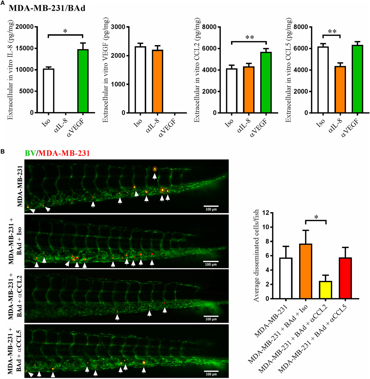Anti-interleukin-8 (αIL-8) decreased CCL5 and anti-vascular endothelial growth factor (αVEGF) increased interleukin-8 (IL-8) and CCL2, which affected the dissemination of estrogen receptor negative (ER−) breast cancer cells (BCC). For monolayer co-cultures, breast pre-adipocytes were differentiated for 5 days before MDA-MB-231 cells were added at 3 × 103 cells/well. For zebrafish experiments, breast pre-adipocytes were differentiated for 12 days and MDA-MB-231 cells were labeled with 4 µg/ml Fast DiI™ oil red dye before injected into the perivitelline space of 2 days old zebrafish embryos, which expressed enhanced green fluorescent protein in endothelial cells. (A) MDA-MB-231 cells were co-cultured with 50% breast adipocytes (BAd) in the presence or absence of αIL-8, αVEGF, or control isotype (Iso) antibodies at 1 µg/ml during 3 days, and secreted cytokines were quantified as described in Section “Materials and Methods,” n = 4 in each group. (B) MDA-MB-231 cells were injected in zebrafish embryos alone or in combination with 50% BAd ± anti-CCL2 (αCCL2), anti-CCL5 (αCCL5), or control Iso antibodies at 0.1 mg/ml, as described in Section “Materials and Methods.” BCC dissemination was analyzed 3 days post-injections, n = 20–24 in each group. Representative images of zebrafish embryos are shown. Arrows show disseminated BCC. BV = blood vessels. Results are presented as mean ± SEM, Student’s t-test, *p < 0.05, **p < 0.01. Data are representative of at least two independent experiments.