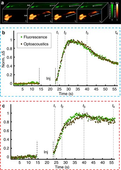 Imaging of neuronal activation in HuC:GCAMP5g zebrafish larvae. (a) Planar epifluorescence (green) and 3D optoacoustic (absorption contrast, orange) images of a 6-day-old larvae at four time points after injection of neurostimulant show a similar dynamics of the signals (scale bar=500 μm). The arrows show direction of the activation as it progresses from the posterior (site of injection marked by a double arrow in the left frame) to the anterior part of the tail. Eyes are marked with a dotted line. (b) Traces of the fluorescence and optoacoustic signals recorded at 25 frames per second show calcium dynamics in the posterior region of the spinal cord (marked by red rectangle in a). (c) Corresponding traces in the anterior region (marked by the blue rectangle). The time points shown in a are marked by vertical dotted lines. Since both the background fluorescence and optoacoustic signals were close or below the noise level, the changes in the signals (ΔS) were normalized to unity instead of being divided by the respective resting signals. The injection phase caused image artifacts and is therefore excluded from the graphs.