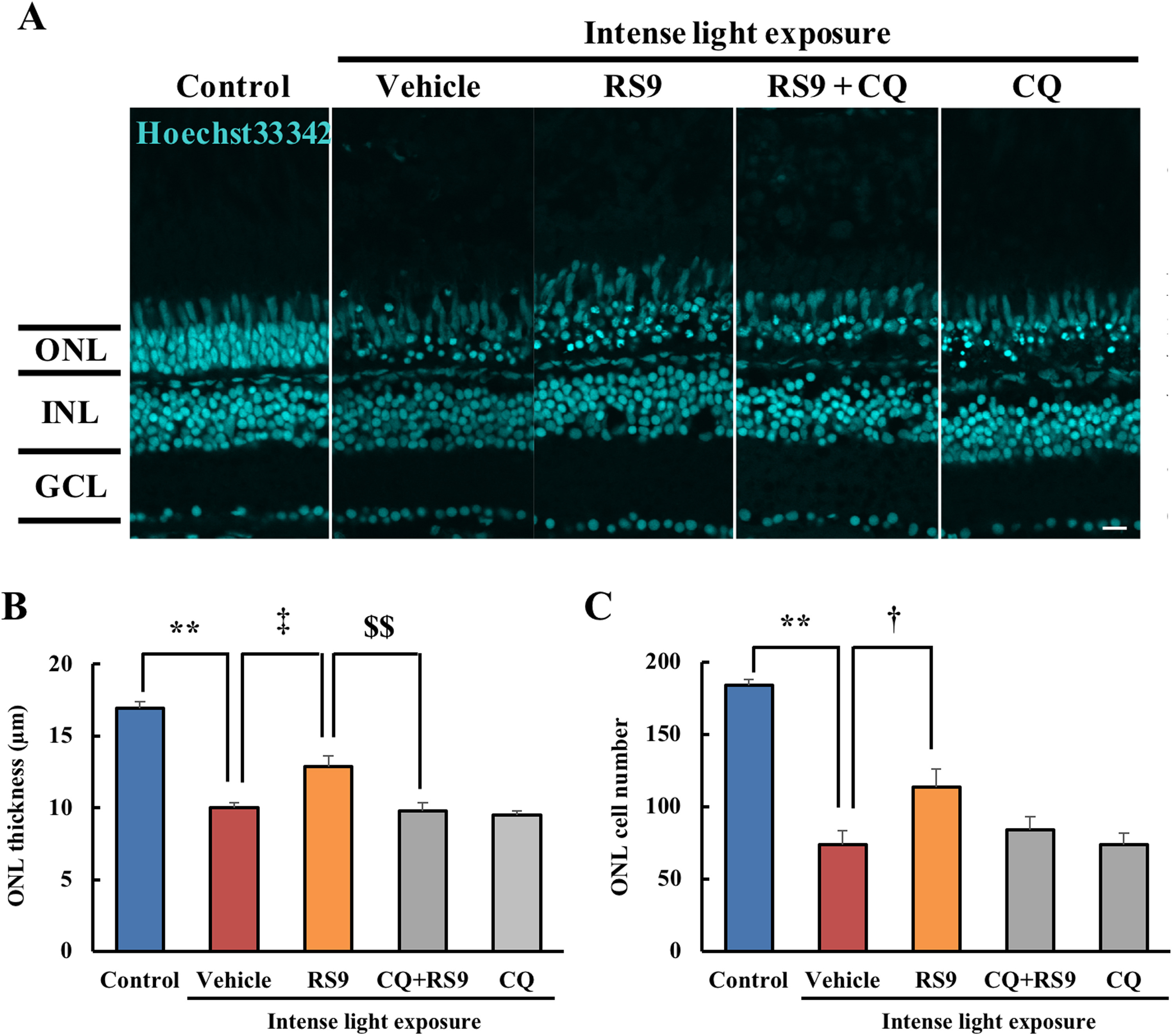 RS9 also protected adult zebrafish retina from intense light exposure via the autophagic pathway. (A-C) Hoechst33342 staining of a cryosection of zebrafish retinas injected intravitreally with RS9 and CQ. (A) Representative image (Hoechst33342: cyan). Scale bar = 10 µm. (B) ONL thickness. (C) ONL cell number. Mean ± SEM (n = 5–6). vs. control **P < 0.01, vs. vehicle; ‡P < 0.01, vs. RS9; $$P < 0.01. ONL: outer nuclear layer, INL: inner nuclear layer, GCL: ganglion cell layer.