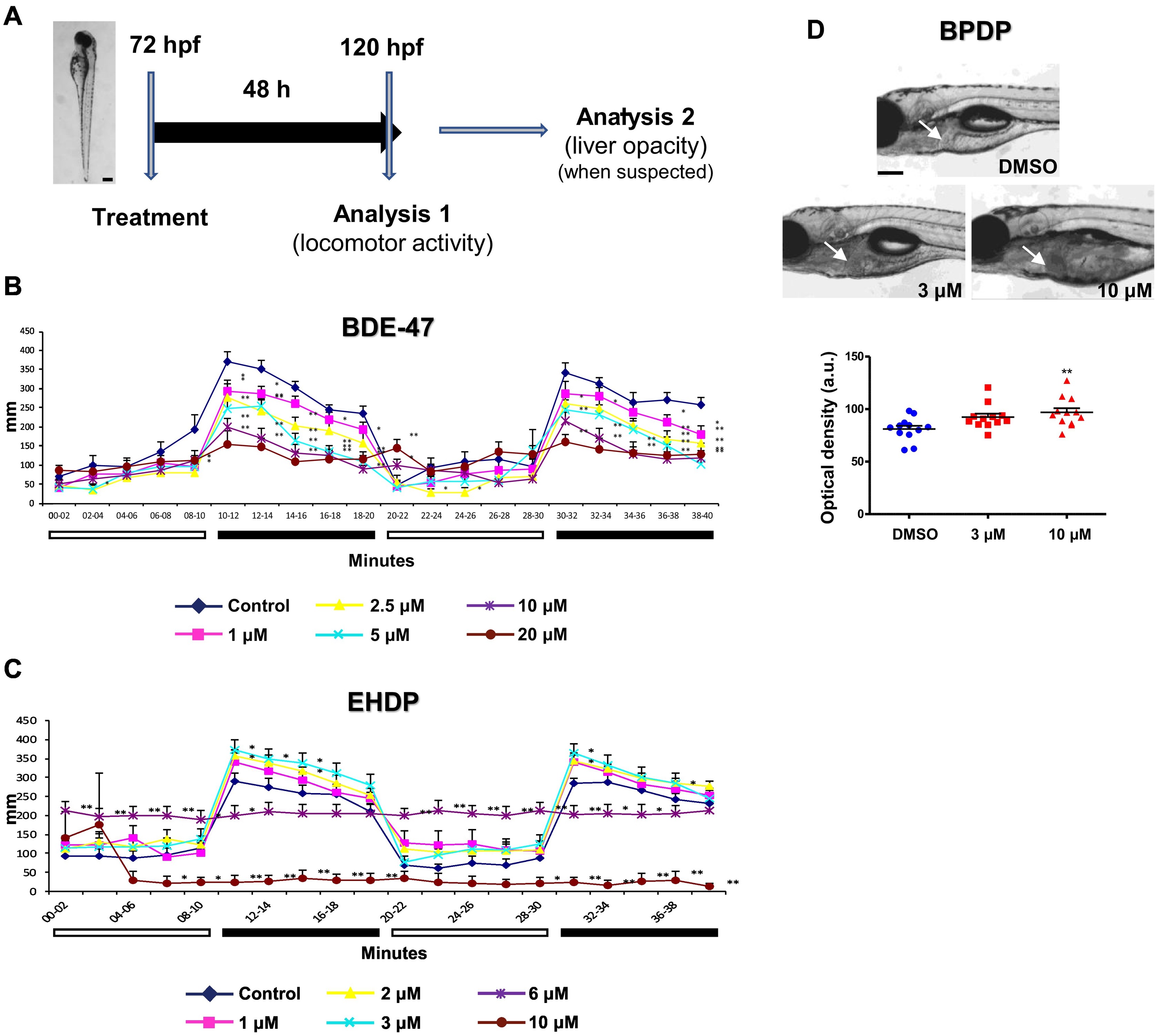 Behavior alteration and hepatotoxicity assay and examples of the results obtained for the phased-out BDE-47 and the replacement EHDP in the behavior assay and for the OPFR BPDP in the hepatotoxicity assay (Experiment 1). A) Schematic depicting a summary of the experimental design for both assays. B, C) Behavior profile of 5 dpf larvae treated with BDE-47. (B) and EHDP (C). Graphs represent the mean of the distance moved by embryos treated with each chemical in 2 min' time bins (*p < 0.05; **p < 0.01, unpaired Student's t-test). White and black rectangles indicate the periods of light and dark respectively. (D) Representative bright field pictures of embryos untreated and treated with BPDP at the indicated concentrations. Arrows point to the position of the liver. Mean ± SEM of the liver optical density from 12 embryos per experimental group is represented in the graph. (⁎⁎p < 0.01, one-way ANOVA and Dunnett's post-test). Scale bar for all pictures represents 200 μM.